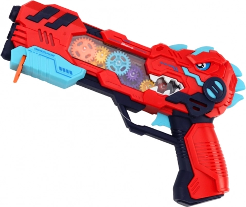 Entdecken Sie actionreichen Spaß mit der Pistole in Dinosaurierform, die Dinosaurierprojektionen, Lichteffekte und Soundeffekte kombiniert. Jeder Druck auf den Abzug startet eine Lichtshow mit rotierenden, beleuchteten Zahnrädern und realistischen Geräuschen.