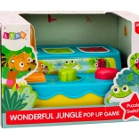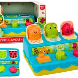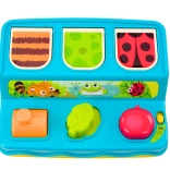 Das Spielzeug besteht aus einer stabilen, farbigen Basis mit verschiedenen Formen und Tasten. Jede Form stellt ein anderes Tier dar, und die Tasten dienen zu deren Aktivierung. Wenn das Kind eine bestimmte Form drückt oder bewegt, springt eines der drei Tierchen heraus, was das Kleinkind zu weiterem Entdecken anregt.