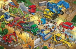 Das Buch enthält stark illustrierte Szenen, die die lebendige Umgebung der Baustelle mit verschiedenen Baumaschinen zeigen.