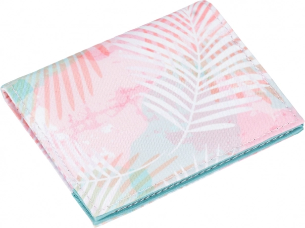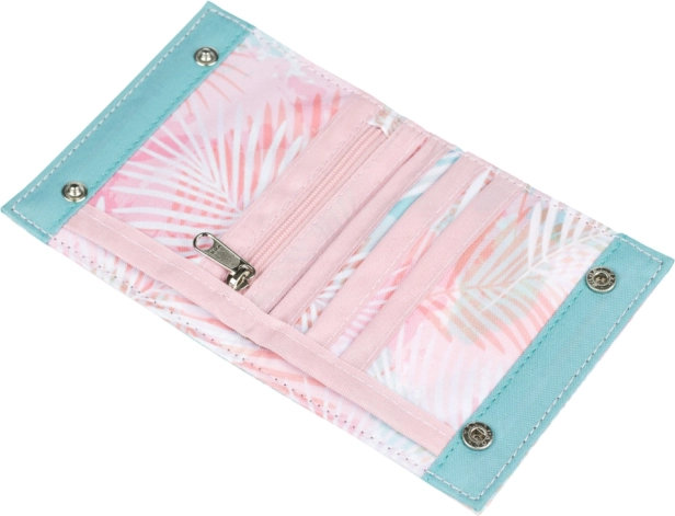 Das Design mit pastelligen Palmblättern verleiht der Geldbörse einen frischen Look und lässt sich leicht mit Rucksack oder Handtasche kombinieren. Die kompakten Maße passen bequem in die Tasche, und das Reißverschlussfach für Kleingeld erleichtert schnelles Bezahlen und die Organisation von Münzen.