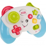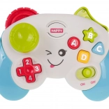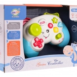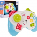 Der Spielcontroller hat ein weißes Gehäuse mit blauen Griffen und farbigen Tasten, die die Sinne der Kinder anregen und visuelle Unterhaltung bieten.