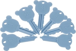 Einzigartige, bärenförmige Schlüssel sind nummeriert und passen jeweils nur zu einem Fahrzeug – fördert Logik und Koordination.