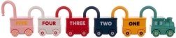 Jedes Fahrzeug trägt die Zahl 0–5 und den englischen Namen, sodass Kinder spielerisch zählen und erste englische Wörter lernen.