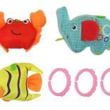 Farbenfrohe Plüschspielzeuge begeistern auf den ersten Blick: Fisch mit Glöckchen, Elefantenbaby mit Melodie und Krabbe mit Quietsche unterstützen interaktives Spiel. Der Bezug lässt sich leicht abnehmen und in der Maschine waschen – für einfache Pflege. Die stabile Konstruktion und die 3-Punkt-Sicherung gewährleisten sichere Nutzung zu Hause und unterwegs.