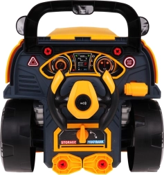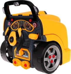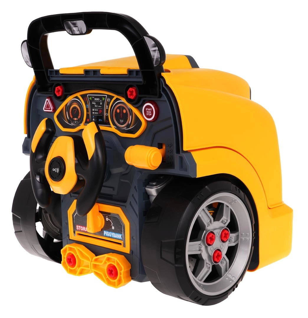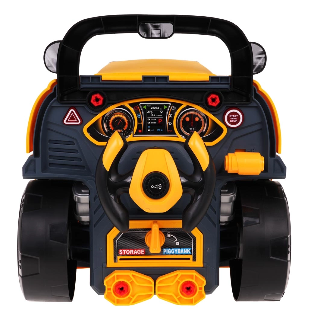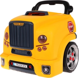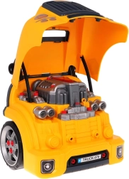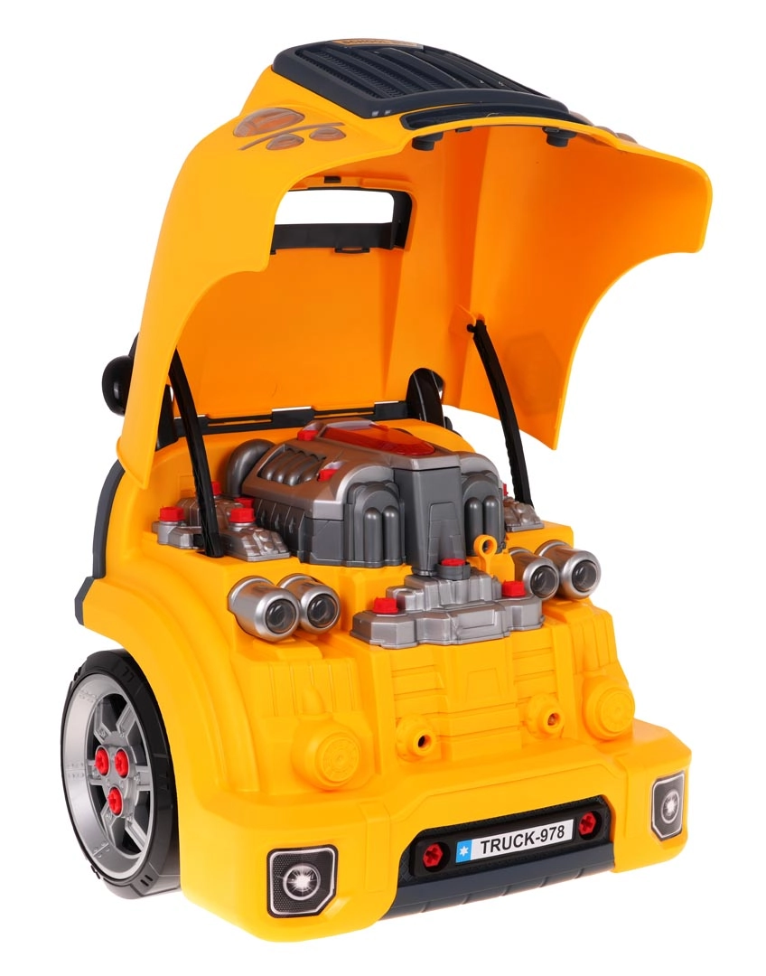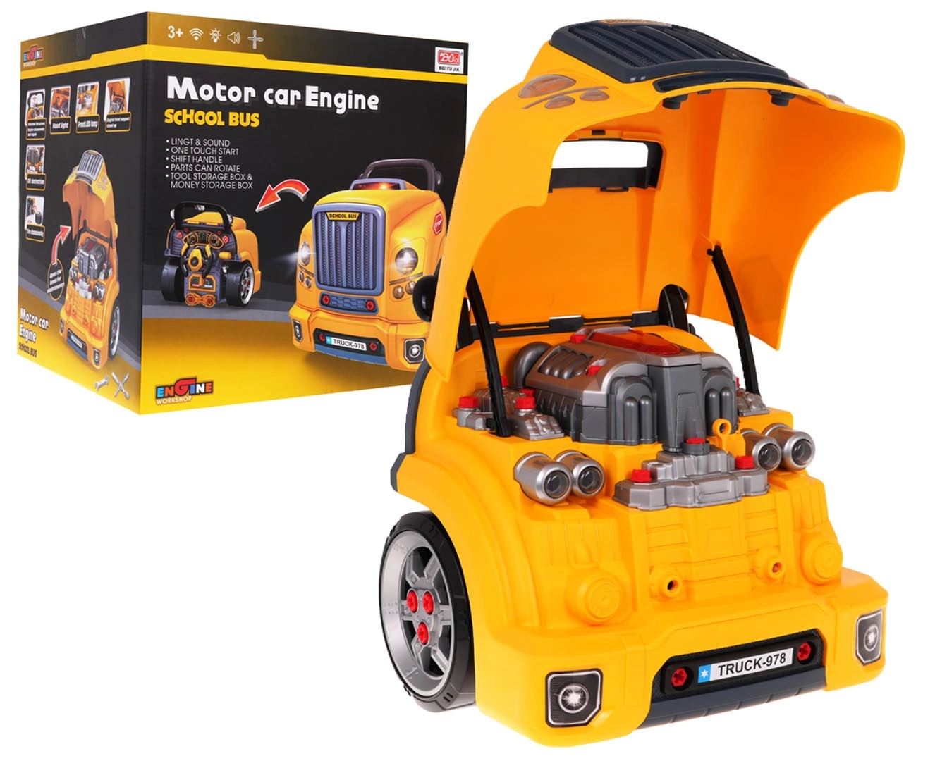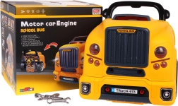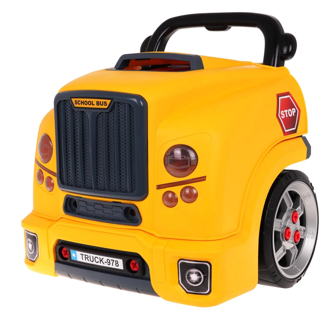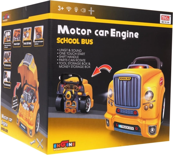 Interaktives Spielzeug: gelber Schulbus mit aufklappbarer Motorhaube und Armaturenbrett, geeignet für Kinder ab 3 Jahren. Das Set enthält Teile zum Zusammenbau der Front des Busses sowie Werkzeuge für Montage und Demontage, wie Schraubendreher und Schlüssel. Unter der Motorhaube befindet sich ein großer, abnehmbarer Motor, den das Kind auseinanderbauen kann. Auch Zündkerzen und Räder lassen sich austauschen. Auf dem Armaturenbrett befinden sich ein Startknopf mit Motorstartgeräusch, ein Lenkrad mit Hupe und ein Notfall-Buzzer. Unter dem Lenkrad gibt es ein Staufach für alle notwendigen Werkzeuge, Schrauben und Knöpfe. Das Spielzeug hat einen bequemen Tragegriff. Betrieb mit 3 AA 1,5 V Batterien (nicht im Lieferumfang enthalten). Dieses Spielzeug für kleine Kfz-Mechaniker fördert die manuelle Geschicklichkeit, die Feinmotorik und die Hand-Auge-Koordination. . Funktionen: . - aufklappbare Bus-Motorhaube, . - drehbarer Motor, . - Geräusche: Motorstart, Fahrt, Rückwärtsgang, .- Hupe am Lenkrad, .- Notsirene, .- leuchtende Scheinwerfer, .- Motorbeleuchtung, .- Werkzeugfach, .- Schalthebel, .- bequemer Tragegriff, .- bewegliche Lenkung, . |
