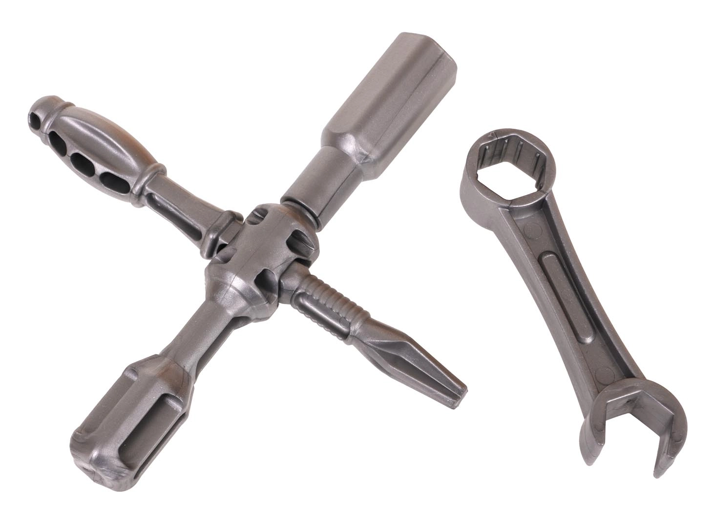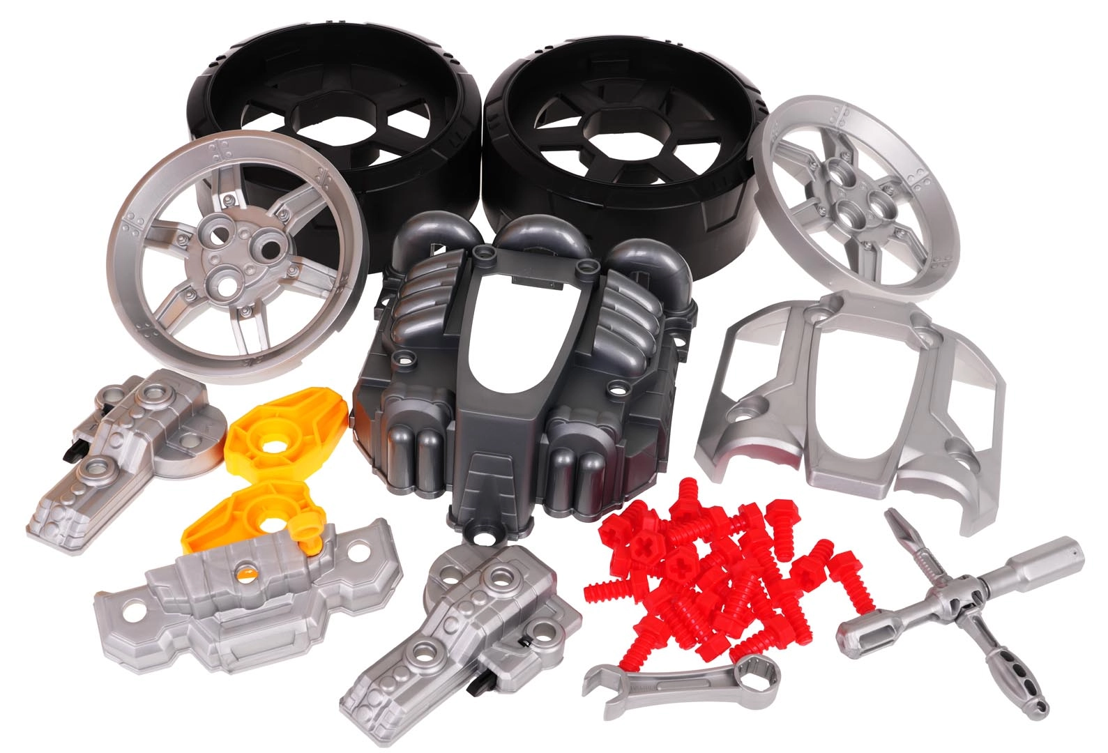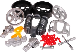- Fahrzeugfront mit abnehmbarem Motor, .- Räder mit Radkappen, .- Schrauben, .- Werkzeuge, .- Zieraufkleber, .- Anleitung. . |