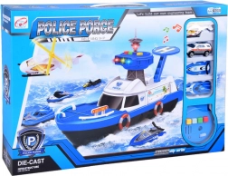 Dieses detailreich gestaltete Polizeiboot in Weiß-Blau ist bereit für jede Mission – auf dem Wasser, an Land und in der Luft. An Bord finden sich ein Helipad mit Hubschrauber, ein Kontrollturm mit Licht- und Soundeffekten sowie ein Innenstauraum für den Transport von Fahrzeugen. Das öffnende Cockpit mit Steuerruder und einer Kapitänsfigur verstärkt den Realismus.