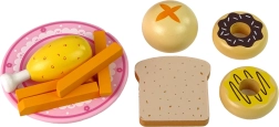 Inklusive Teller und einer Auswahl an Lebensmitteln: Donuts, Gebäck, Pommes frites und Hähnchenkeule – ideal zum Servieren und für Rollenspiele als Koch.
