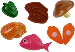Das Set enthält farbenfrohe Plastikzutaten, die imaginative Spiele und das Lernen über Lebensmittel anregen.