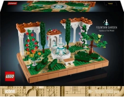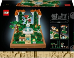 Nehmen Sie sich Zeit für sich und tauchen Sie ein in die ruhige Gartenatmosphäre mit dem markanten mehrstöckigen Brunnen, weißen Säulenpergolen mit roten Dächern und üppigem Grün. Zypressen, blühende Kletterpflanzen, Petunien, Hibiskus sowie kleine Tierdetails – ein Vogel, ein Frosch und ein Falter – lassen das Modell lebendig wirken.