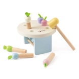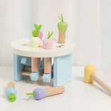 Zarte Pastellfarben ziehen die Aufmerksamkeit auf sich und steigern das Interesse des Kindes am Spielzeug. Das Spiel besteht darin, die Geschicklichkeit zu trainieren, indem die Karotten präzise hineingehämmert werden, die aus der Öffnung herausspringen.