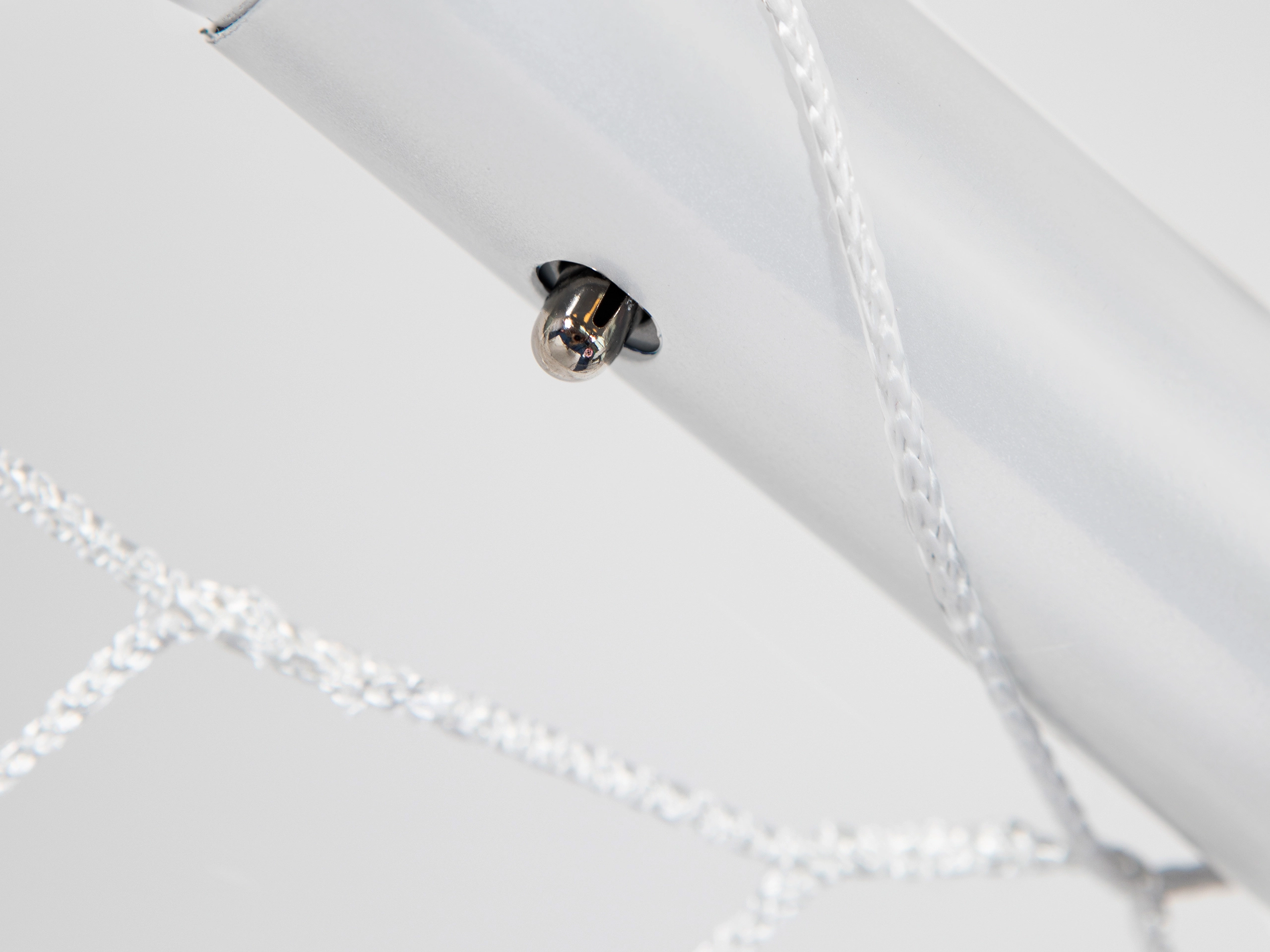 Die Montage dauert nur 15 Minuten! Die Teile werden mit Verriegelungen verbunden, was eine schnelle Montage und Demontage des Tores erleichtert. Im Set sind auch Metallstifte enthalten, um das Tor am Boden zu sichern.