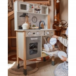 Diese WOOPIE GREEN Holzküche wurde für kleine Köchinnen, Köche und Entdecker entwickelt. Die Vorderseite bietet eine umfangreich ausgestattete Kochzone mit Kaffeemaschine, Mikrowelle, Spüle, Ofen, Geschirrspüler und einer Induktionskochplatte mit Licht und Geräuschen. An der Seite befindet sich eine praktische Waschmaschine mit Wäschekorb, die spielerisch Alltagsroutinen vermittelt. Die Rückseite verbirgt eine Kreidetafel und eine farbige Weltkarte zum Zeichnen, Kennenlernen der Kontinente und zur Entfaltung der Fantasie.