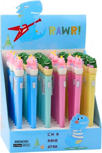 Der obere Teil des Stifts ist mit einer Gummifigur eines Dinosauriers verziert, die als dekoratives Element dient und dem Ganzen Charme verleiht. Dank der Kappe ist die Schreibspitze gut vor dem Austrocknen geschützt und ein eingebauter Knopf aktiviert die effektvolle LED-Beleuchtung, die bei jedem Drücken aufleuchtet.