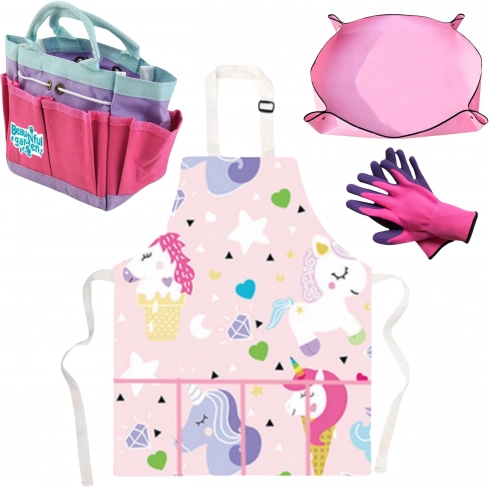 Woopie Set für kleine Gärtner 18-tlg. mit Einhorn-Motiv. Sichere Werkzeuge, Schürze und Tasche. Toller Spaß und Lernen für Kinder ab 3 Jahren.