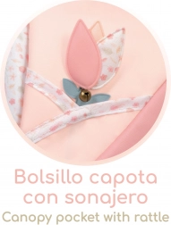 Praktische Details bereichern das tägliche Spiel: schwenkbare Vorderräder für eine sanfte Fahrt, Aufbewahrungskorb für Kleinigkeiten, Tasche am Verdeck mit Stofftulpe und Glöckchen sowie eine dekorative Wannenabdeckung mit Klettverschlüssen und Täschchen. Der Wagen ist klappbar, nimmt daher wenig Platz ein und lässt sich leicht im Auto transportieren.