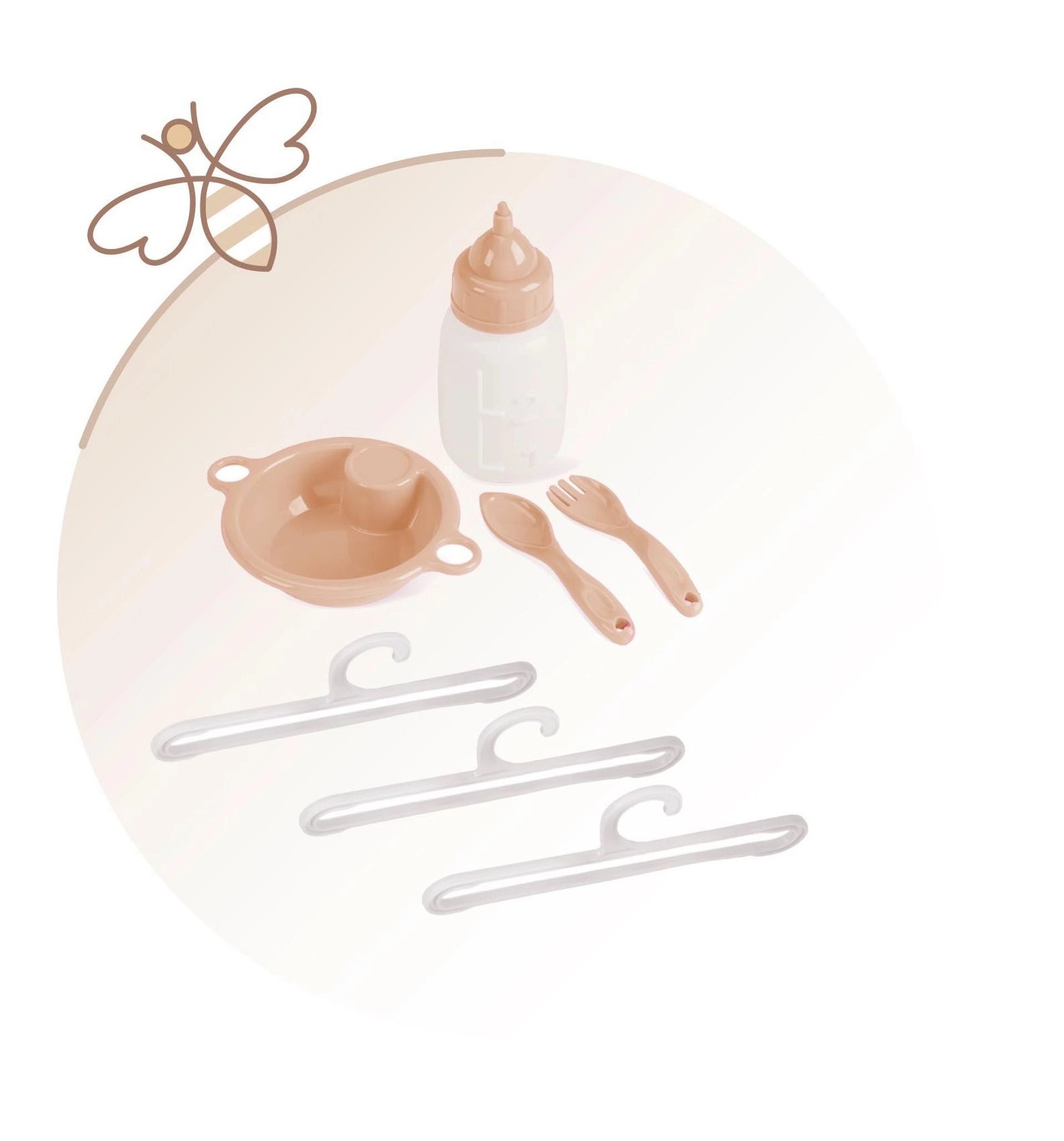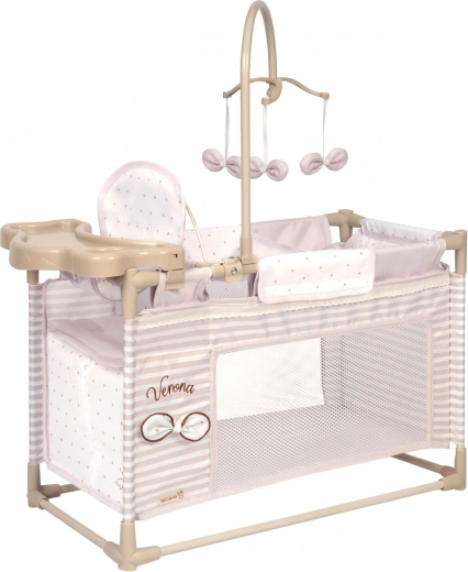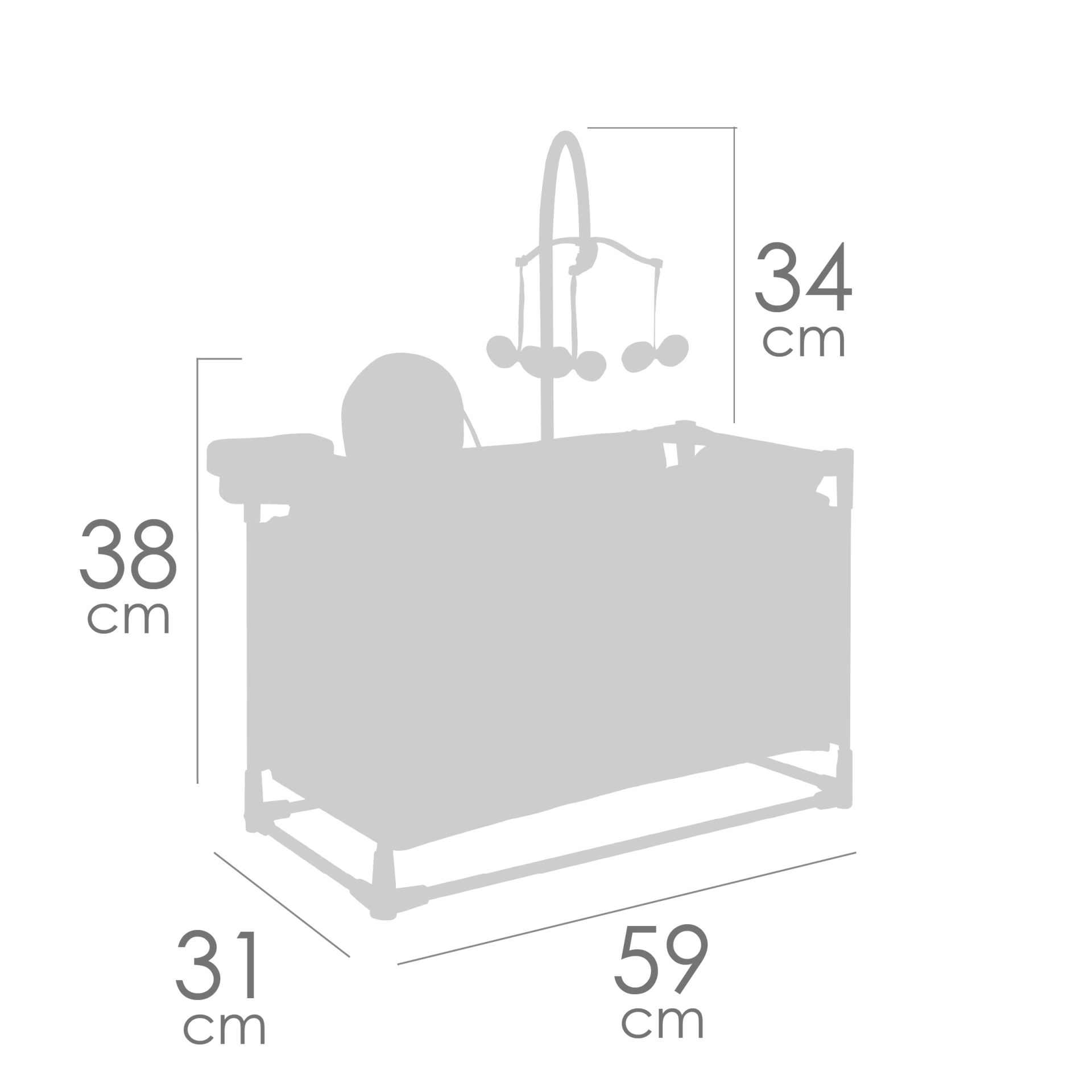 Enthalten ist alles, was kleine Puppeneltern brauchen: ein Mobile zur Unterhaltung der Puppe, ein Wickeltisch für die Pflege, ein Hochstuhl mit Fläschchen, Schüssel und Besteck sowie ein praktischer Kleiderschrank mit Reißverschluss und Kleiderbügeln. Der Liegebereich mit Netzfenster ermöglicht es Kindern, die Puppe stets im Blick zu behalten, und die großzügige Basis sorgt für Komfort beim Spielen.