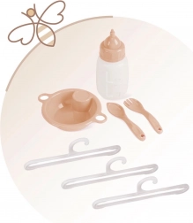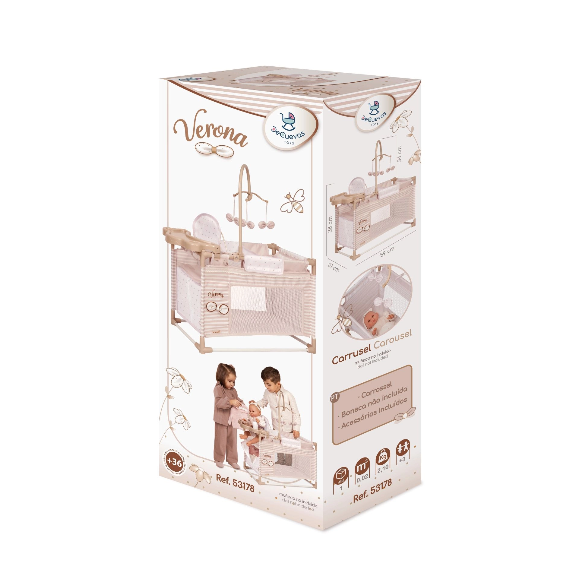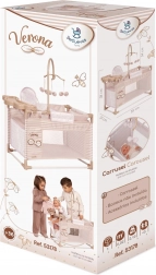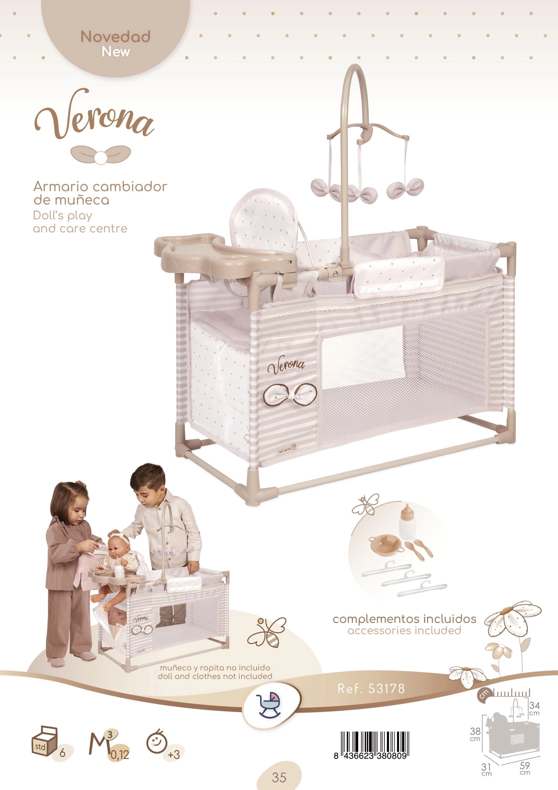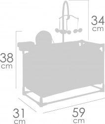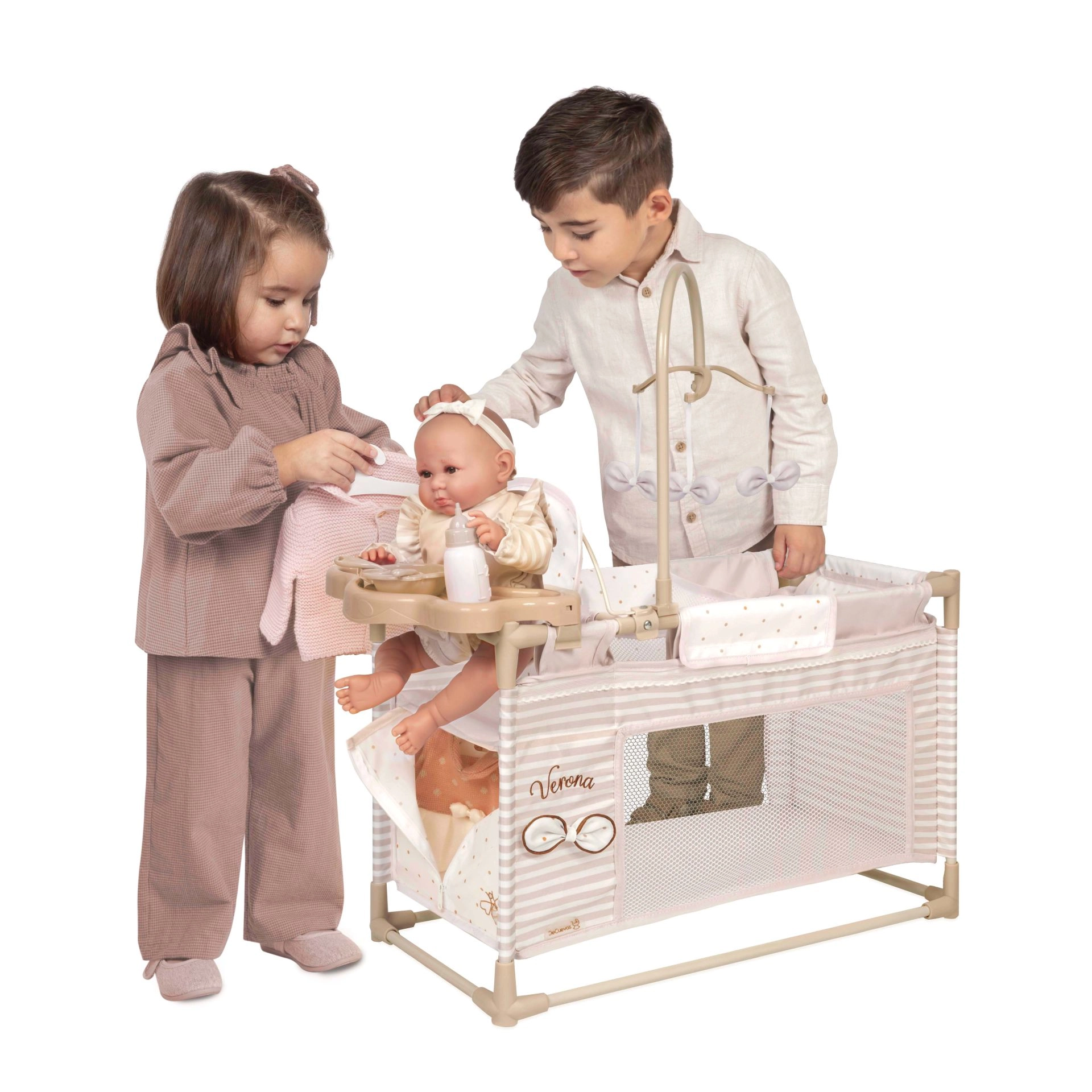 Enthalten ist alles, was kleine Puppeneltern brauchen: ein Mobile zur Unterhaltung der Puppe, ein Wickeltisch für die Pflege, ein Hochstuhl mit Fläschchen, Schüssel und Besteck sowie ein praktischer Kleiderschrank mit Reißverschluss und Kleiderbügeln. Der Liegebereich mit Netzfenster ermöglicht es Kindern, die Puppe stets im Blick zu behalten, und die großzügige Basis sorgt für Komfort beim Spielen.