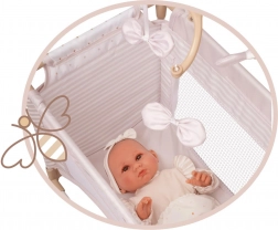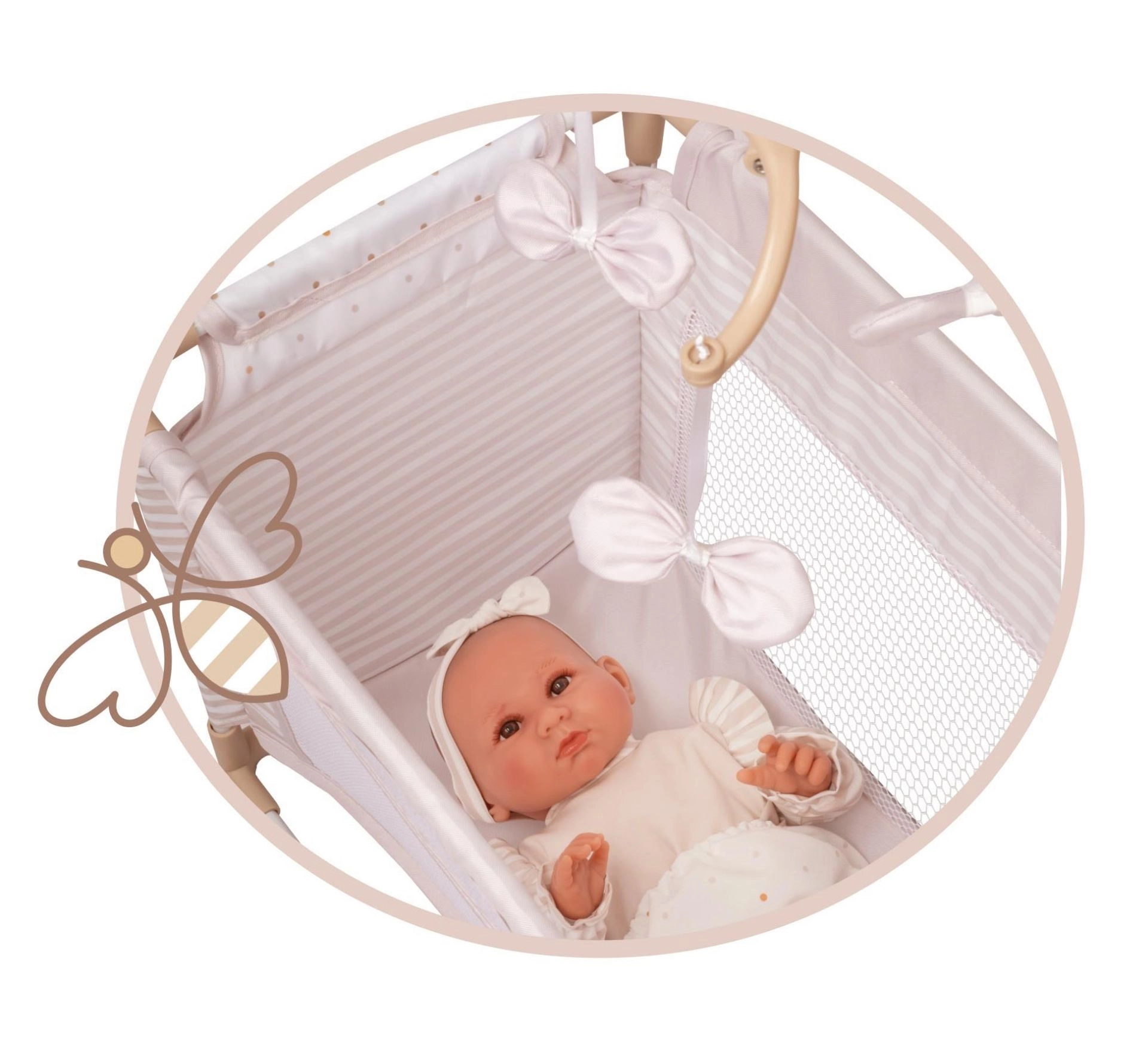 Dieses elegante Puppenbett in pastelligen Beige- und Weißtönen ergänzt stilvoll jedes Kinderzimmer. Es kombiniert eine natürliche Optik mit niedlichen Details wie Punkten, Streifen und dezenten Schleifchen, die an Blütenblätter erinnern. Durch die hochwertige Verarbeitung und die stabile Konstruktion ist das Spielen sicher und komfortabel.
