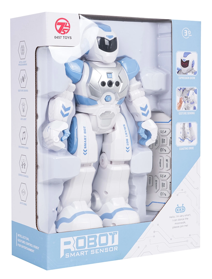 Der SMART-BOT ist ein zuverlässiger Gefährte für neugierige Kinder. Dank der stabilen Konstruktion aus hochwertigem Kunststoff beherrscht er Gehen, seitliches Gleiten, 360°-Rotation und Tanzen zur Musik. Beleuchtete Augen, Geräusche und Lieder fördern Fantasie und Rhythmusgefühl, während Reaktionen auf Reize und einfache Hinweise zu guten Gewohnheiten zu positivem Verhalten motivieren.