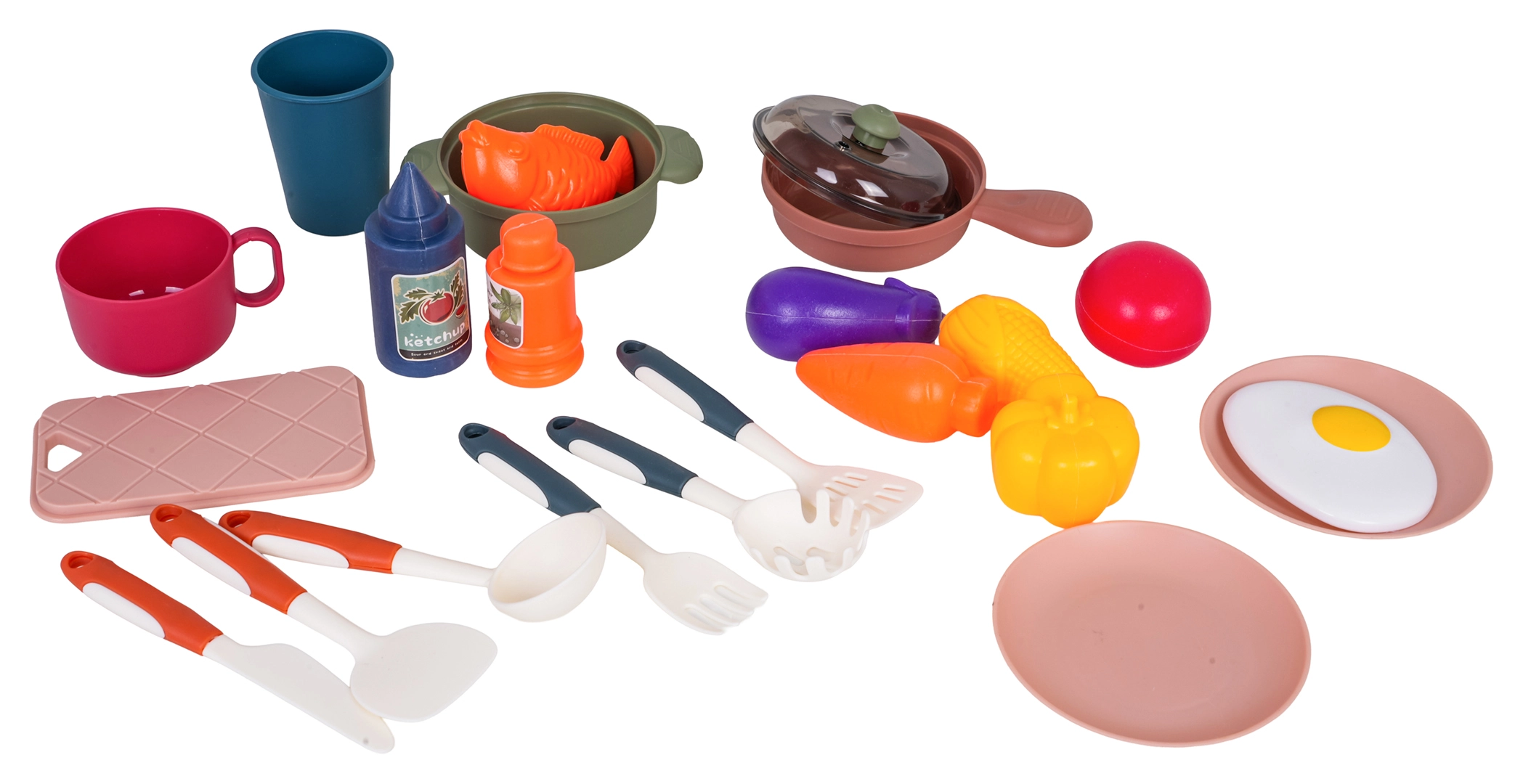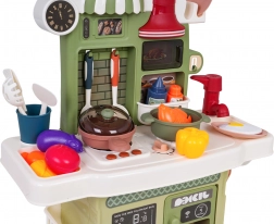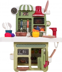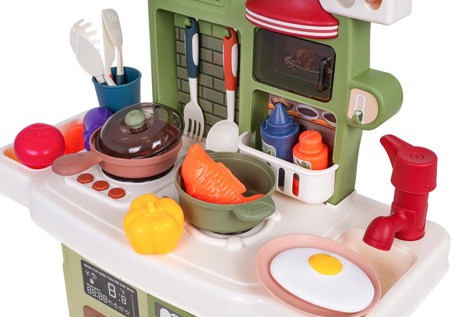 Zum Lieferumfang gehört ein funktionierender Pump-Wasserhahn mit Umlaufwasser, sodass Kinder Geschirr „abwaschen“ können wie in einer echten Küche. Ebenfalls dabei: eine Kaffeemaschinen-Attrappe, eine beleuchtete Dunstabzugshaube und ein zu öffnender Backofen. Zahlreiches Zubehör – Töpfe, Pfannen, Teller, Utensilien und Lebensmittel – erweitert die Spielmöglichkeiten.