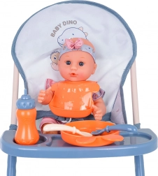 Komfortables Füttern dank Hochstuhl mit abnehmbarem Tablett und Set aus Besteck, Tellerchen, Lätzchen und Fläschchen. Ideal für realistische Pflegeszenarien.