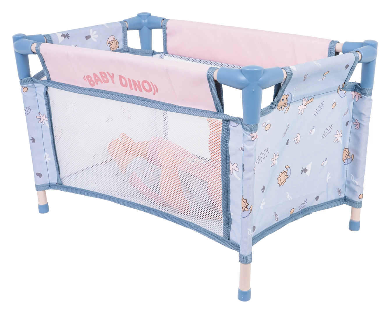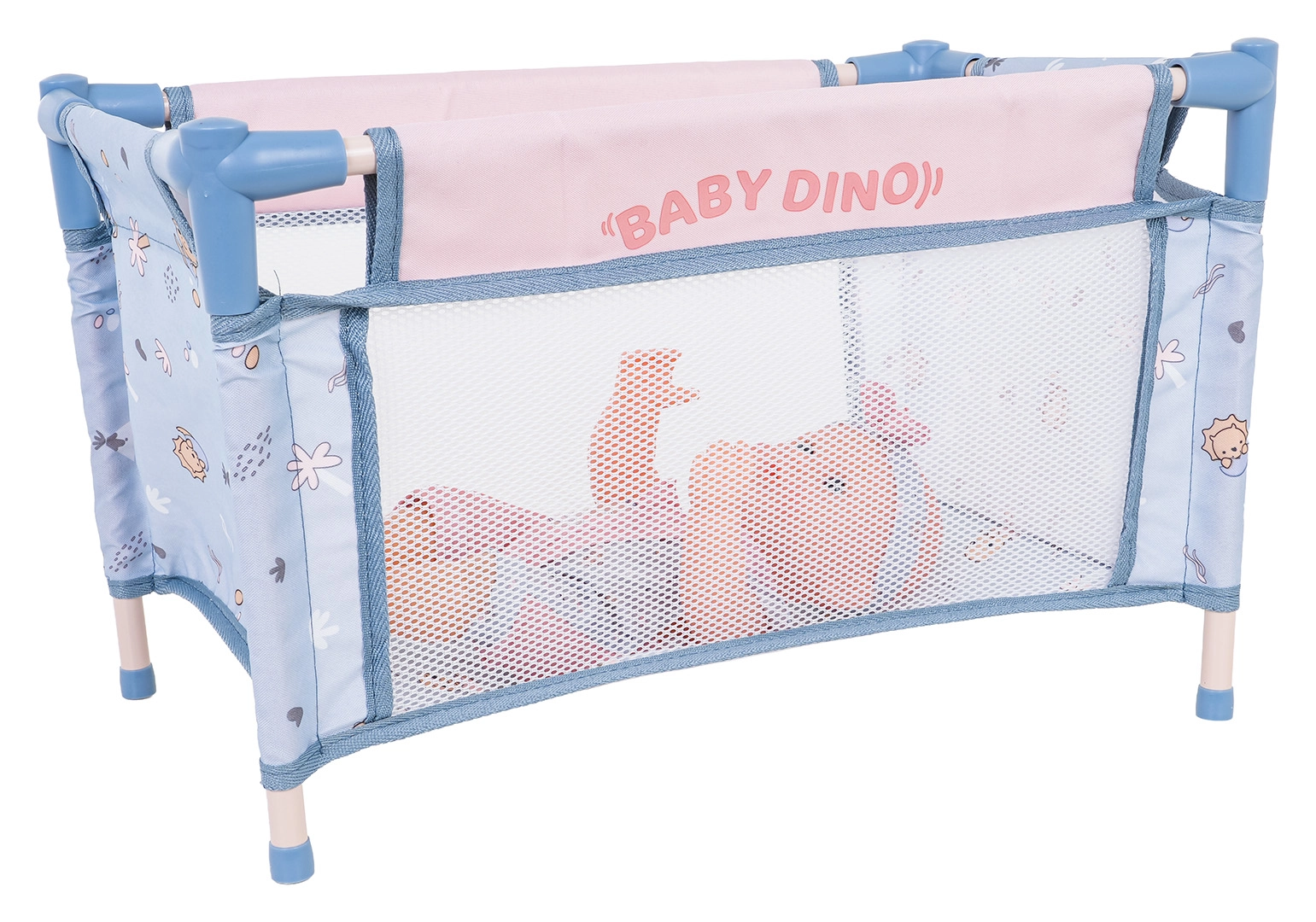 Praktischer Laufstall/Schlafplatz mit stabiler Konstruktion und Mesh-Seiten für bessere Sicht und Luftzirkulation. Passend zum BABY-DINO-Motiv.