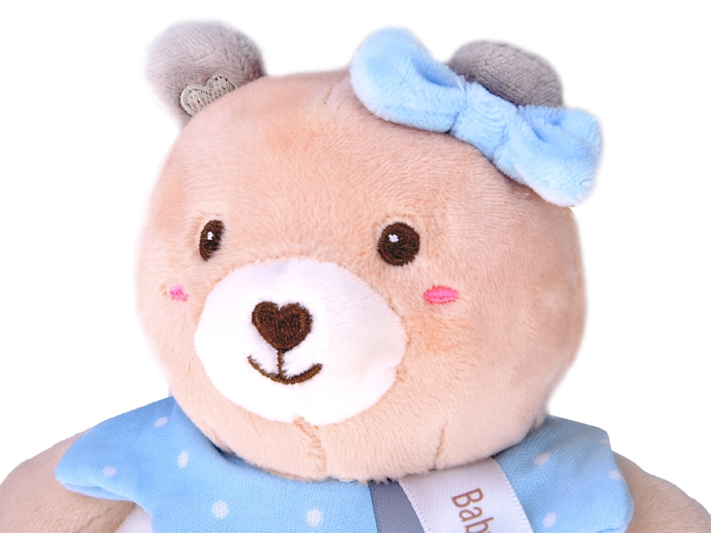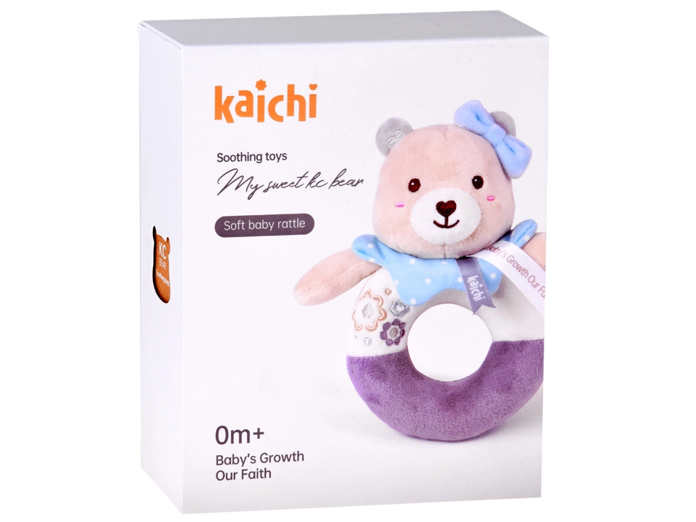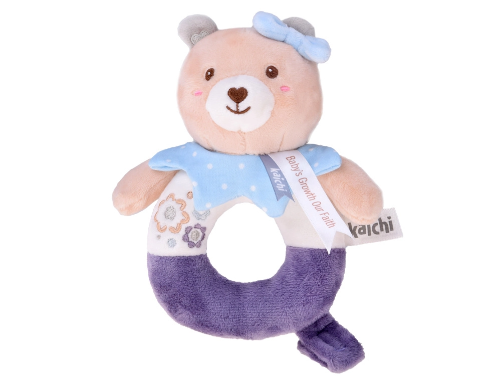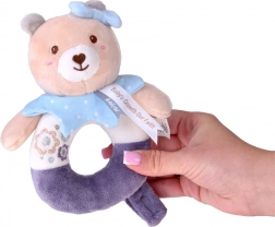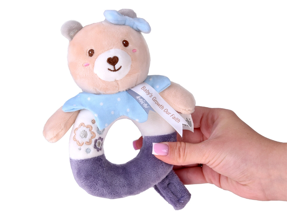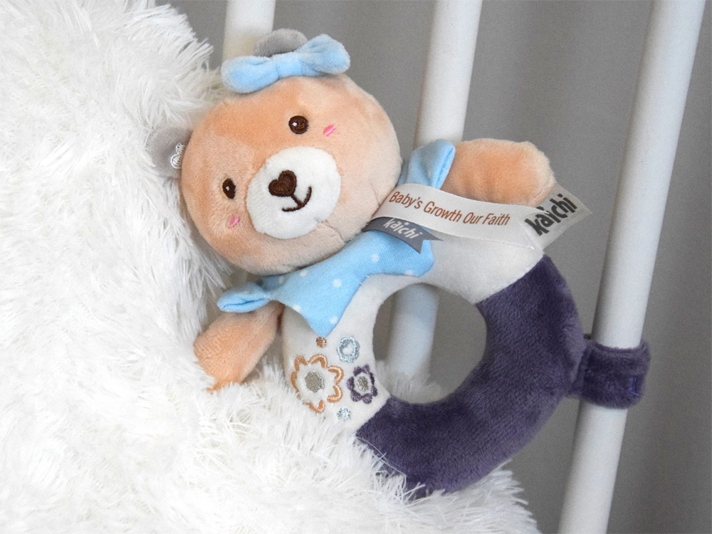 Die Bären-Plüschrassel wurde aus hochwertigen, sehr weichen Materialien gefertigt, die sich angenehm anfühlen. Die Ringform erleichtert das Greifen und Halten – ideal für die ersten Versuche des Babys, den Griff zu üben. Feine, aufgestickte Details (Augen, Schnäuzchen, Verzierungen) sorgen für maximale Sicherheit ohne kleine Teile.