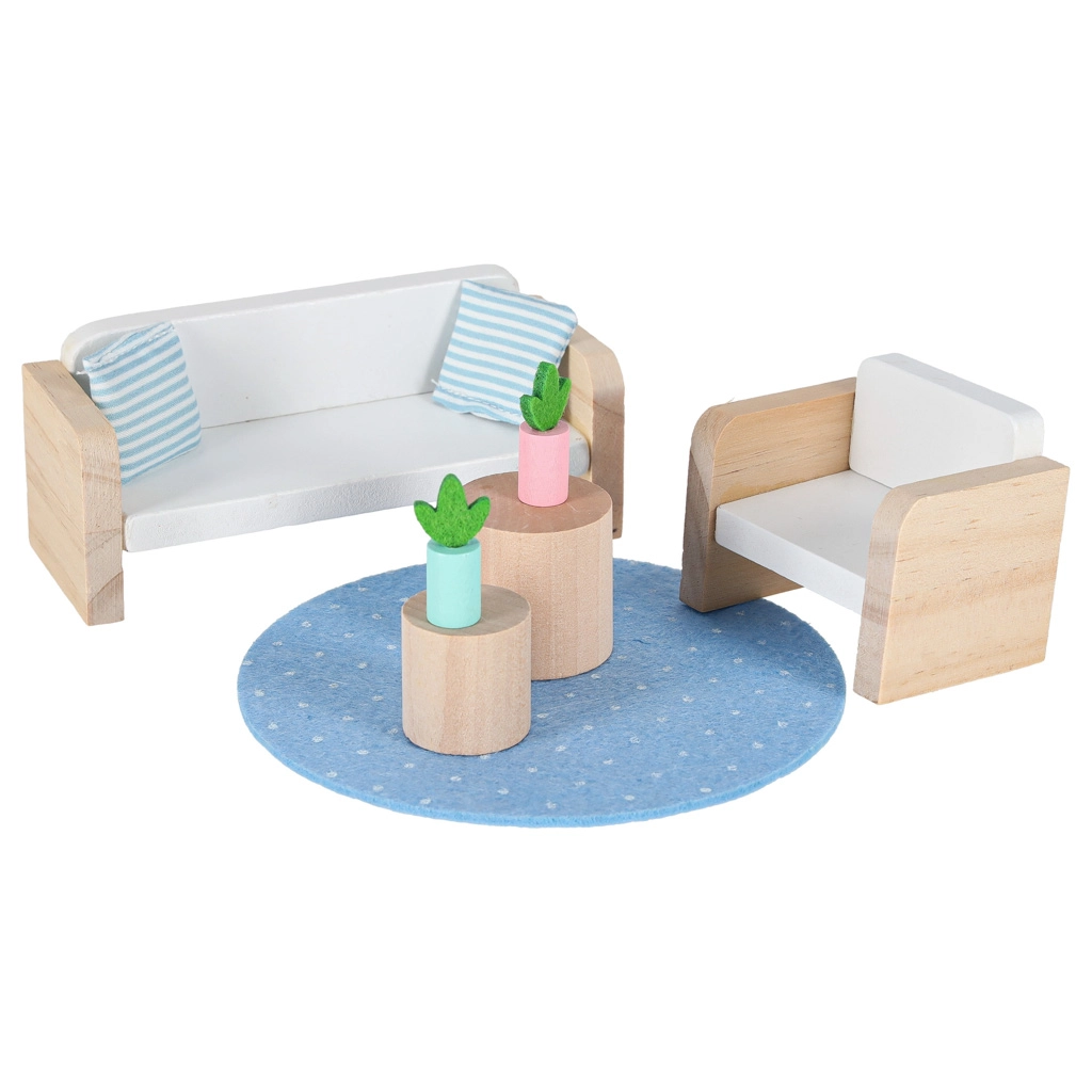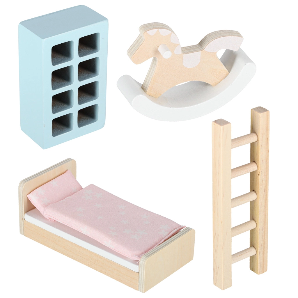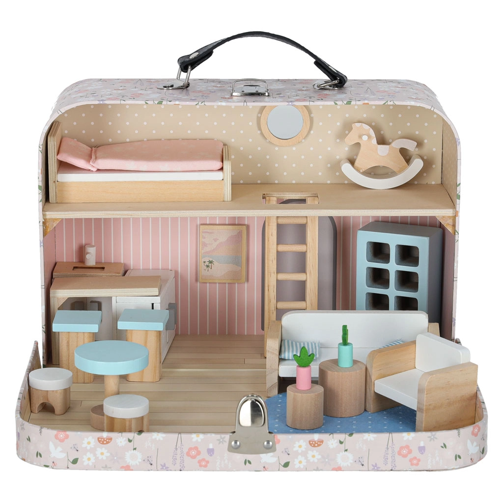 Dieses Mini-Puppenhaus im Koffer verwandelt sich nach dem Öffnen in ein zweistöckiges Interieur mit Küche, Wohnzimmer und Schlafzimmer. Zarte Pastellfarben in Kombination mit natürlichem Holz schaffen eine gemütliche Atmosphäre und laden zum Rollenspiel mit Puppen oder Figuren ein.