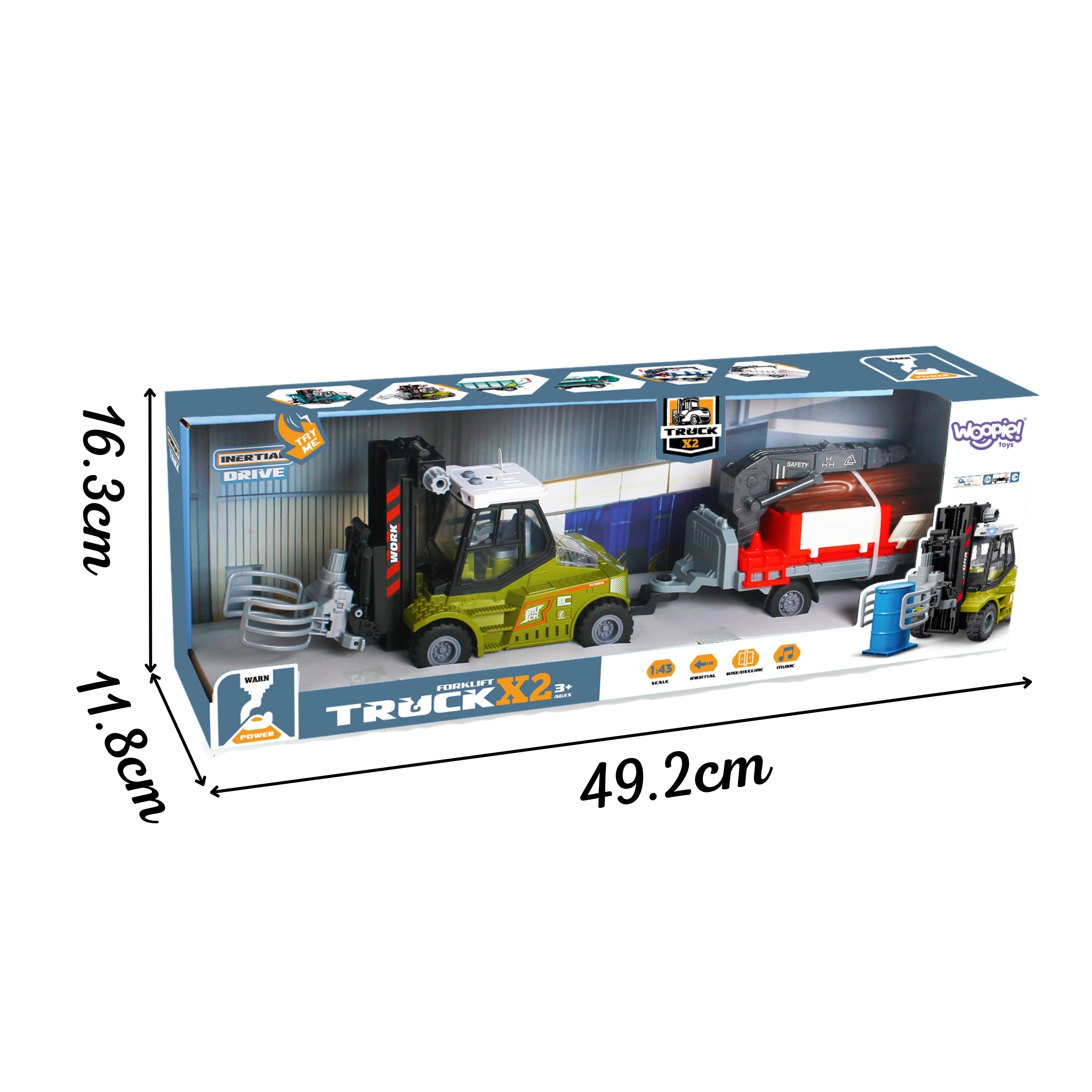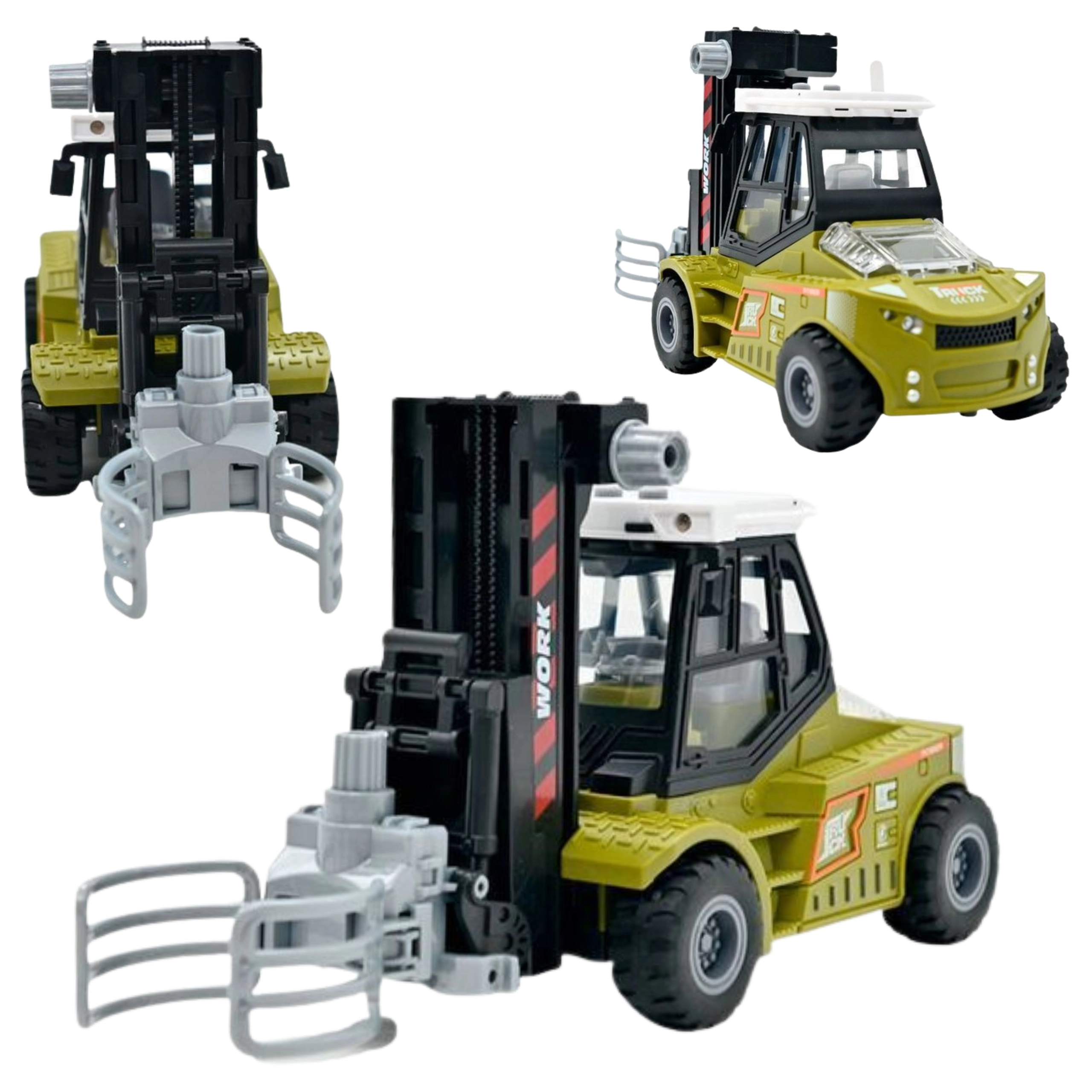 Das realistische Modell im Maßstab 1:43 begeistert kleine Fans von Bau- und Transportmaschinen. Der Gabelstapler verfügt über einen Schwungmassetantrieb – einfach anschieben und er fährt nach vorne. Der bewegliche Arm mit Greifzange ermöglicht das Anheben und Transportieren von Holzstämmen, während der Anhänger mit aufklappbaren Seitenwänden das Be- und Entladen erleichtert.