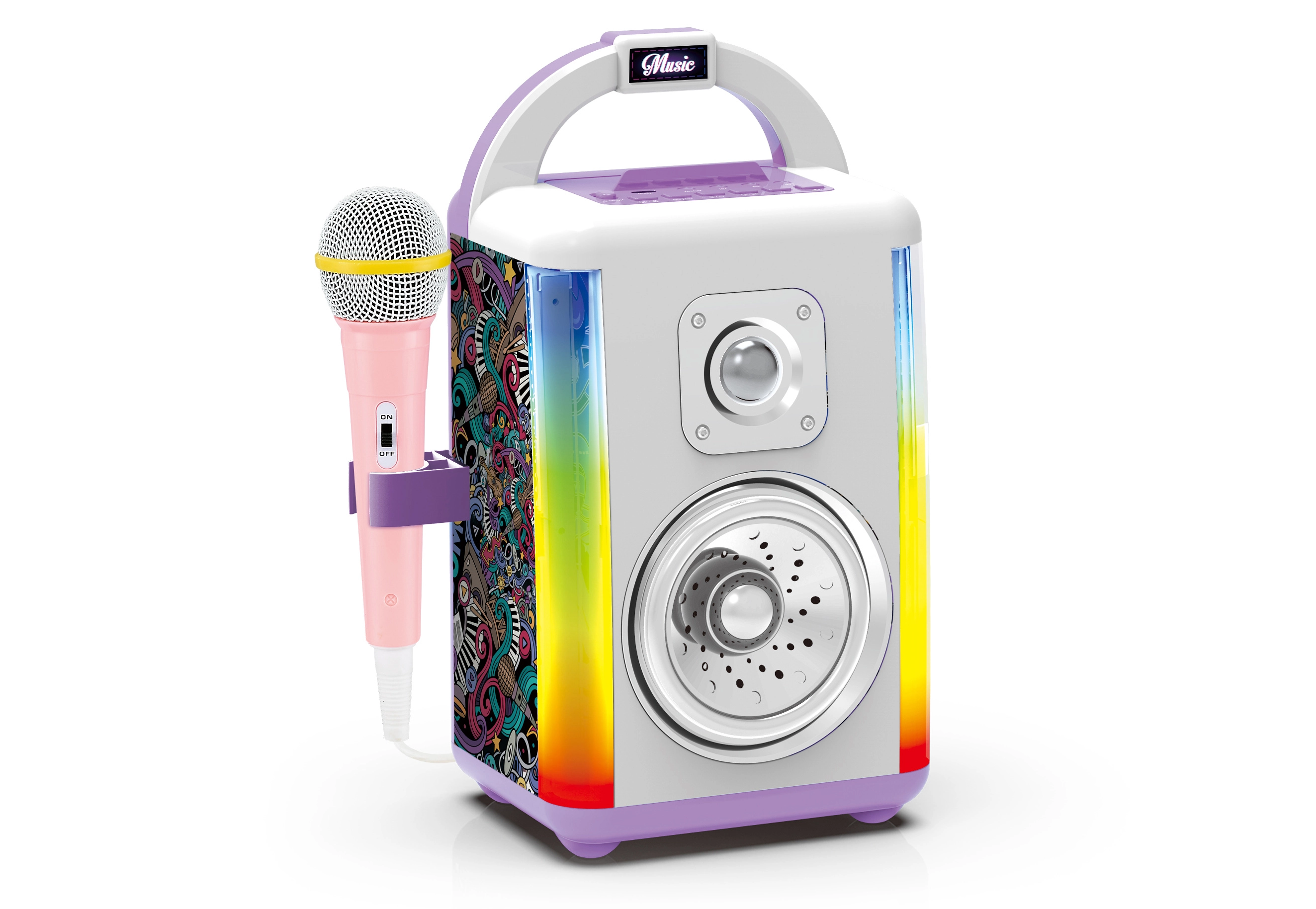 Diese tragbare Musikbox ist eine hervorragende Wahl für Kinderpartys, Familienfeiern und Gesangstraining. Dank Bluetooth spielst du Musik bequem vom Smartphone ab, der AUX-Eingang erweitert die Anschlussmöglichkeiten und mit den integrierten Effekten kannst du aufnehmen und die Stimme verändern – für noch mehr Spaß. Buntes LED-Licht in fünf Modi sorgt für die richtige Show-Atmosphäre.