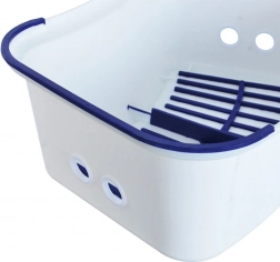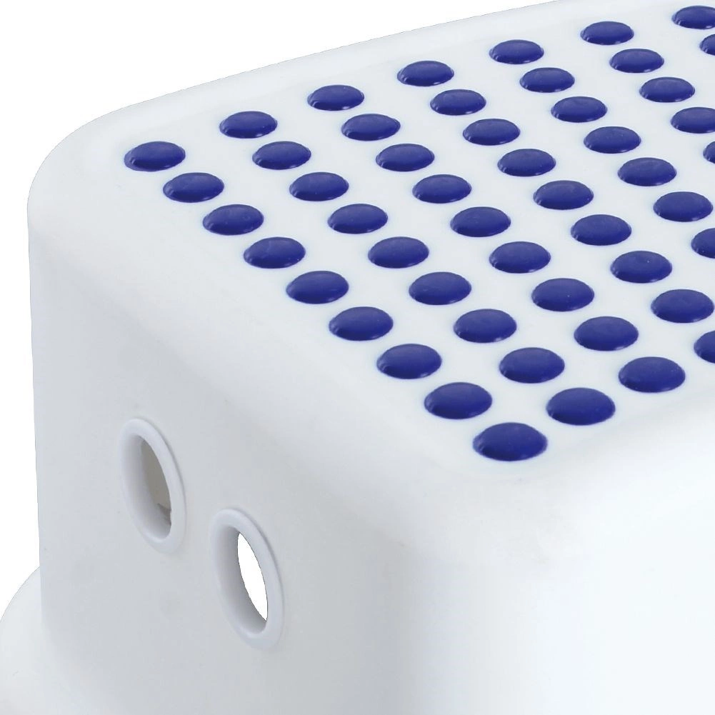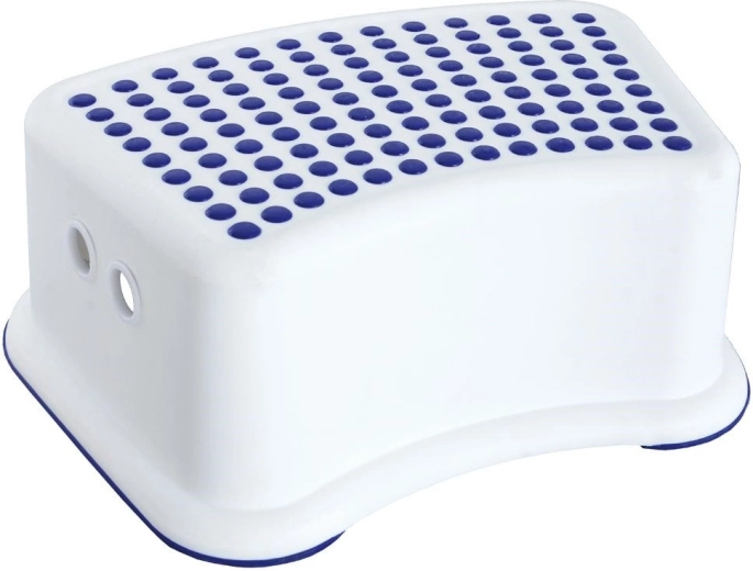 Praktische und rutschfeste Trittstufe für Kinder und Erwachsene erleichtert den täglichen Zugang zum Waschbecken, zu Regalen oder zur Dusche. Bietet eine stabile Konstruktion, kompakte Maße 26 × 36 × 13 cm und eine Tragfähigkeit bis 80 kg. Hergestellt aus hochwertigem Kunststoff in Weiß mit blauen Elementen und rutschfestem Gummi auf der Oberseite und an den Unterkanten.