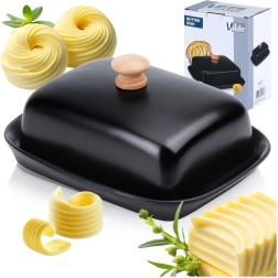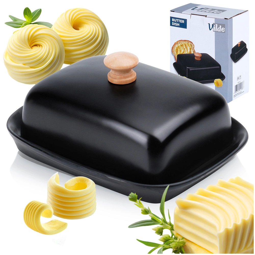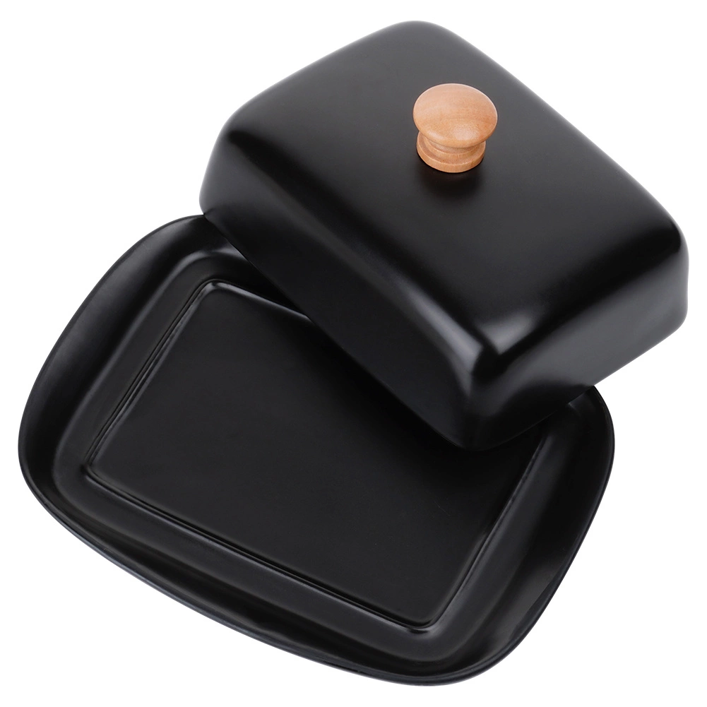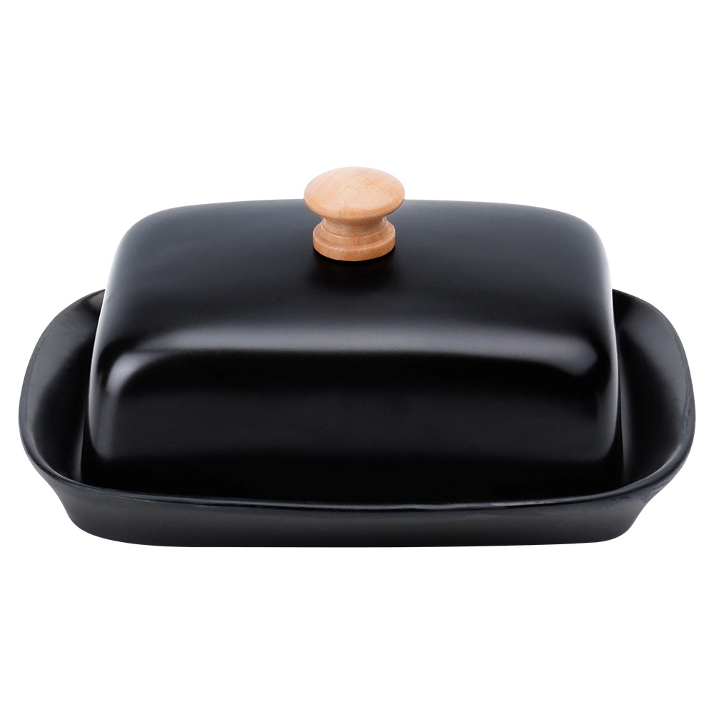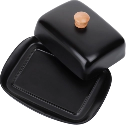 Diese stilvolle Butterdose aus hochwertiger Keramik in schwarzer Ausführung ist ideal für den täglichen Gebrauch zu Hause und zum Servieren am Tisch. Der Holzgriff am Deckel ermöglicht ein komfortables Anheben, während die dicht schließende Abdeckung die Butter vor dem Austrocknen und vor Fremdgerüchen schützt.