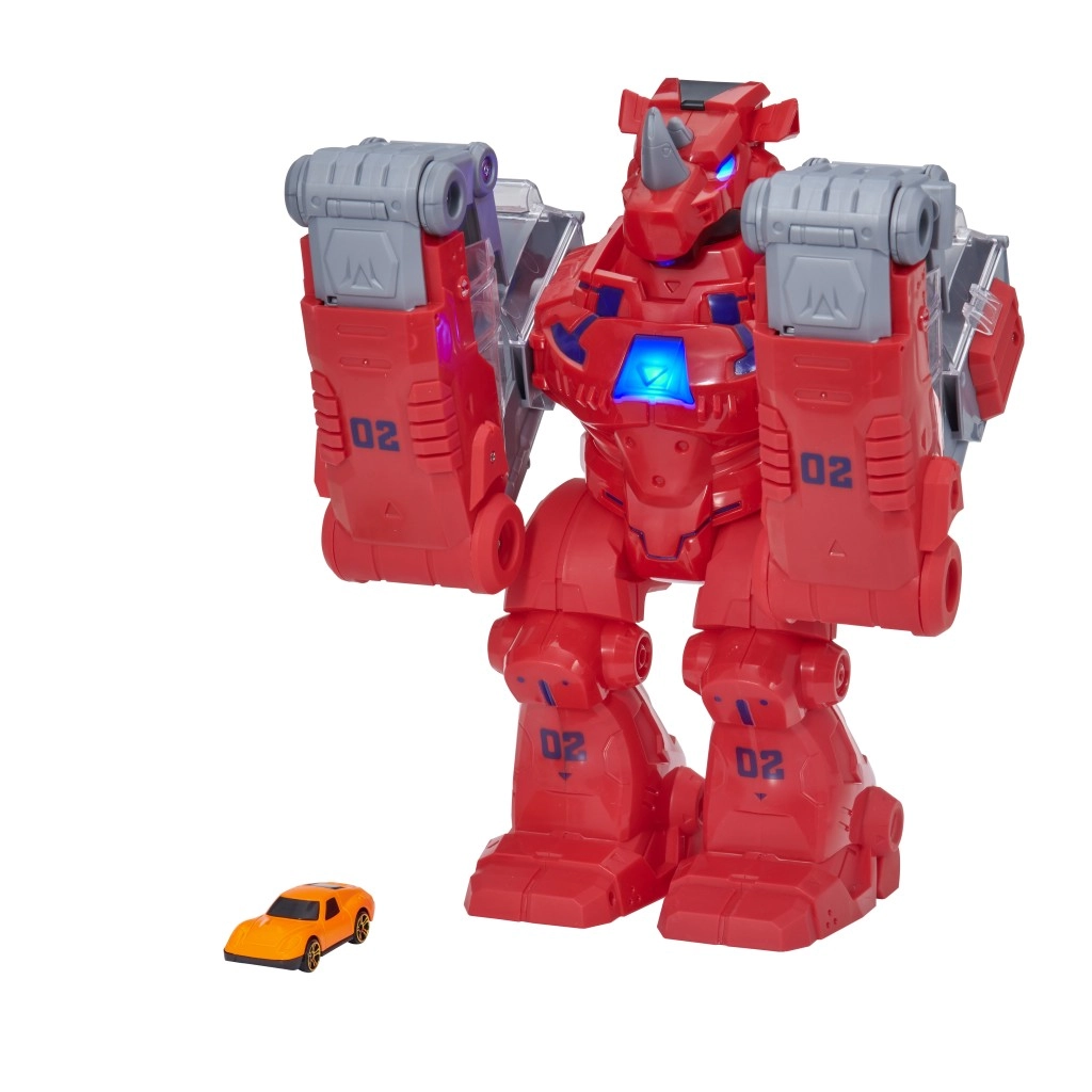 Der Teamsterz Robo Wreckerz Rhino Slam bietet Kindern ein dynamisches Spielerlebnis. Die robusten Arme öffnen sich, du lädst das Auto ein und durch Drücken des Nashornkopfes wird das Fahrzeug über transparente Bahnen in beiden Armen nach unten abgeschossen. Blau leuchtende LED-Augen und Lichteffekte auf der Brust zusammen mit donnernden Geräuschen verstärken die Action-Atmosphäre.