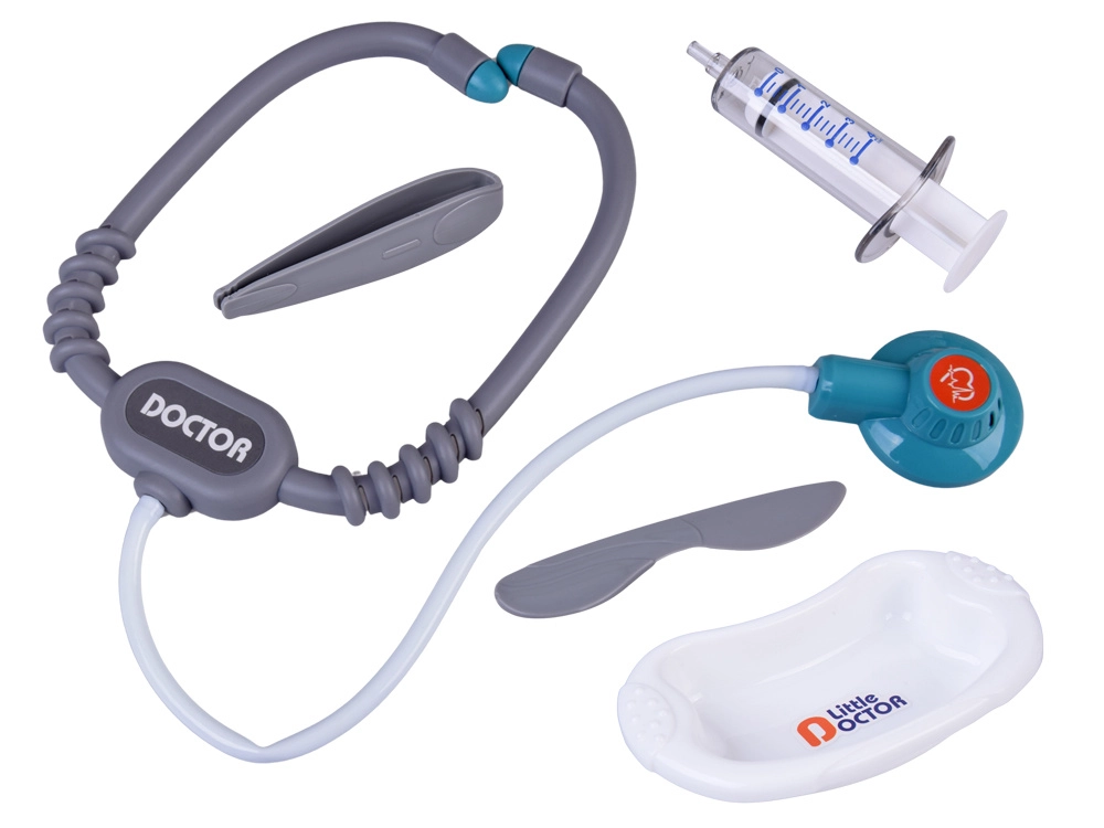 Stethoskop mit Geräusch, elektronisches Thermometer, Spritze, Schere, Pinzette, Otoskop, Hämmerchen, Spiegel, Schale, Infusion, Blister mit „Tabletten“, Schachteln und Fläschchen mit „Arzneien“