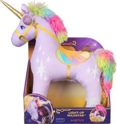 Das Plüscheinhorn WILDSTAR ist von der beliebten Serie UNICORN ACADEMY inspiriert. Es besteht aus weichem lila Plüsch mit hellen „magischen“ Motiven, hat ein glitzerndes goldenes Horn und Hufe, eine regenbogenfarbene Mähne und einen Schweif sowie ein elegantes Zaumzeug. Bei Berührung der Stirn leuchten das Horn und die dekorativen Elemente am Körper in warmem LED-Licht auf, begleitet von einem magischen Klang.