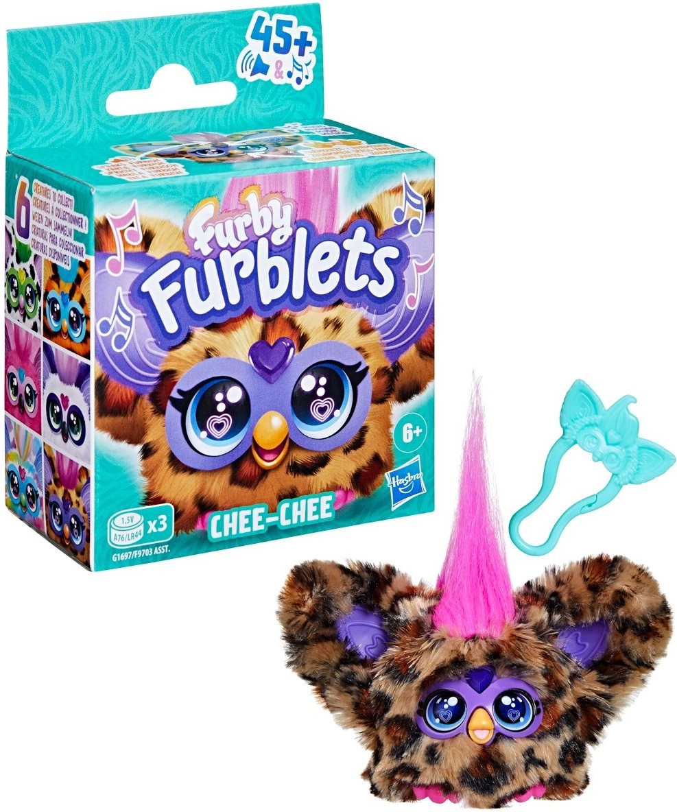 Entdecken Sie den niedlichen Freund Furby Furblet Chee-Chee, der über 45 Soundreaktionen bietet, fröhliche Musik spielt und auf Furbish kommuniziert. Dank des abnehmbaren Clips lässt er sich leicht an Rucksack oder Tasche befestigen – Spaß überall dabei.