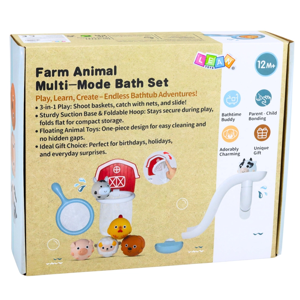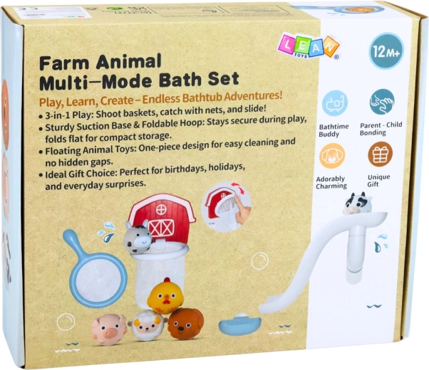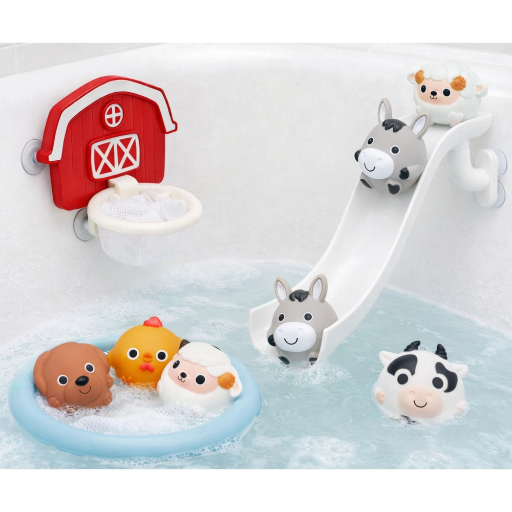 Verwandeln Sie das Baden mit einem Bauernhof-Set in Spaß! Kinder lieben die Rutsche für Tierchen, das Körbchen mit Netz zum Fangen und die spritzen­den und quetschbaren Tierchen, die auf dem Wasser schwimmen. Dank der Saughalterungen lassen sich die Teile leicht auf glatten Oberflächen befestigen, und die weichen, sicheren Materialien sind ideal für kleine Kinderhände.