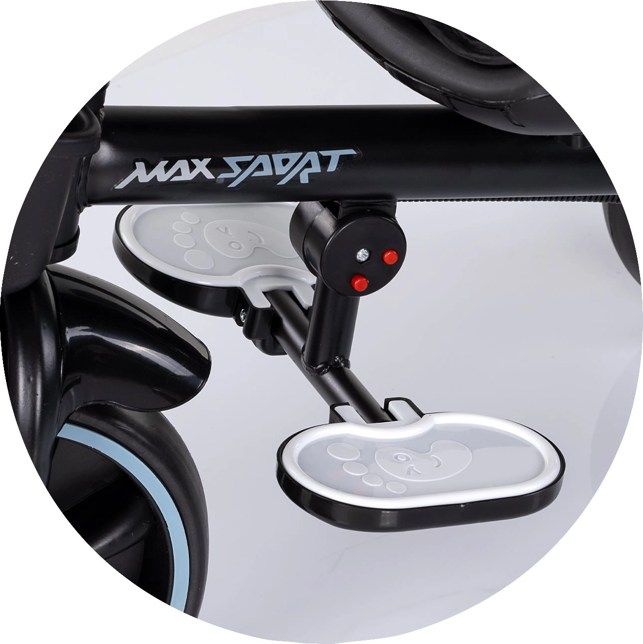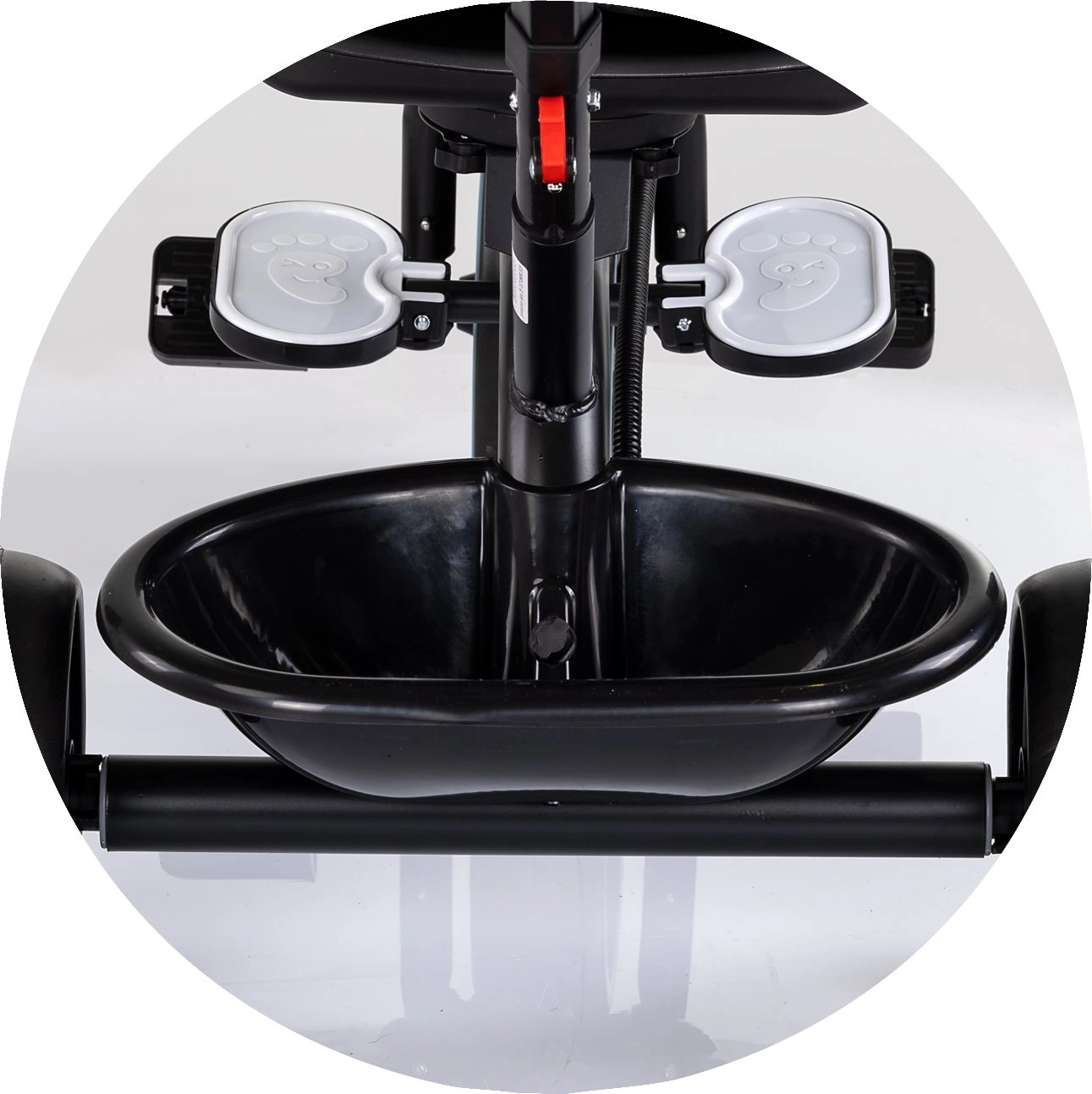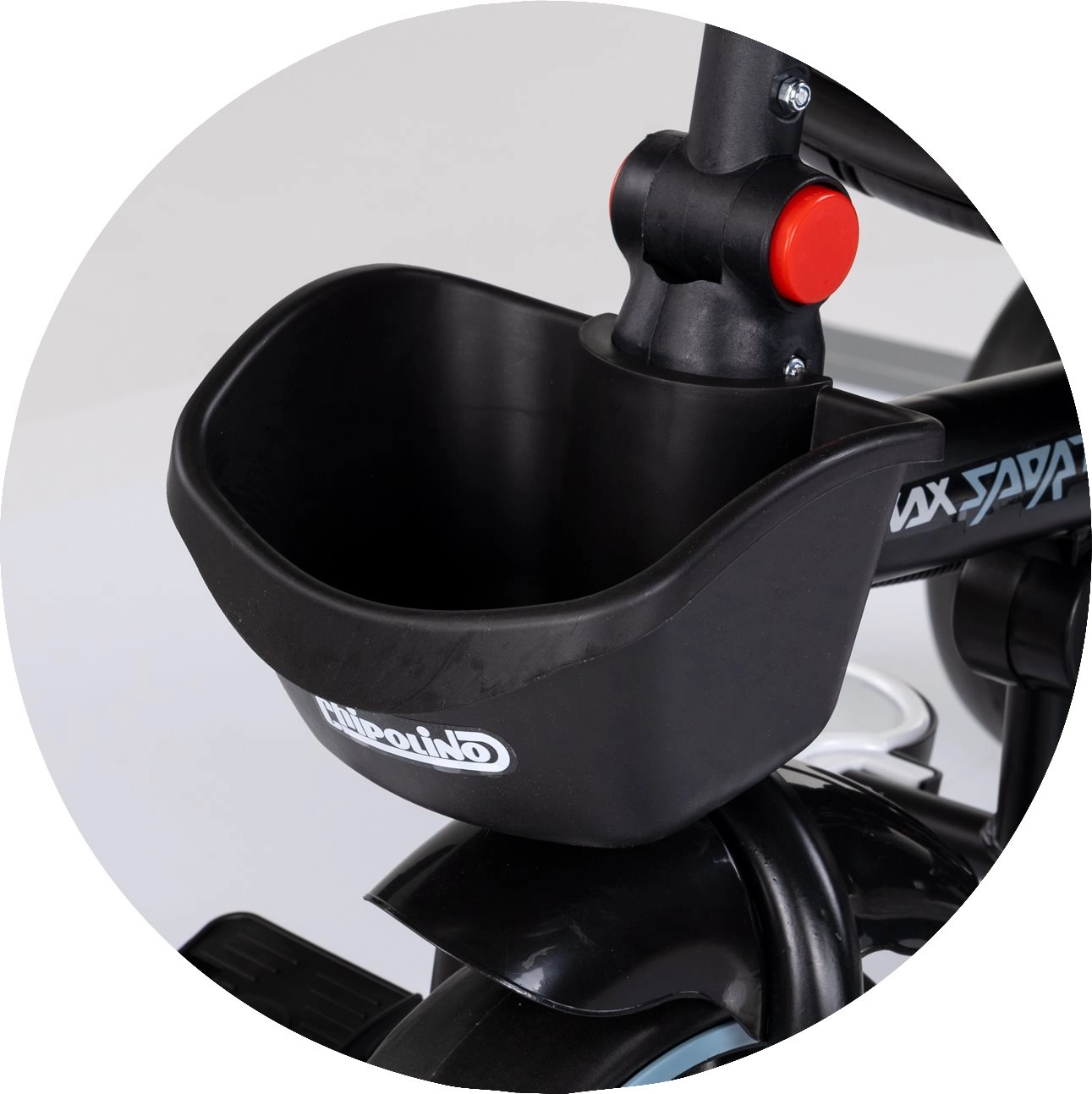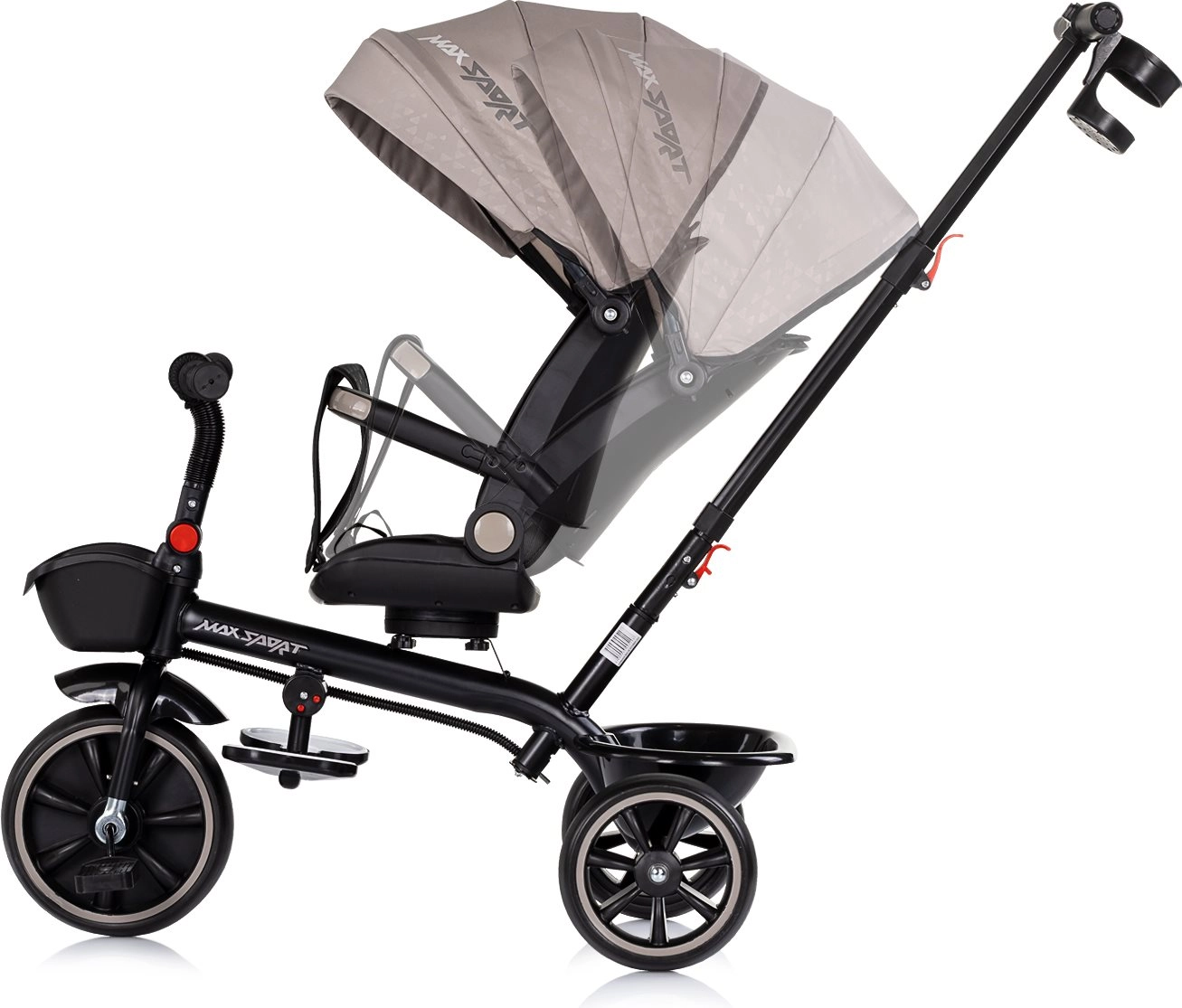 Für maximalen Komfort ist das Dreirad mit weicher Textilpolsterung, Sicherheitsgurt, klappbaren Fußstützen und geräumigen Körben vorne und hinten ausgestattet. Der verstellbare Elterngriff in zwei Höhen ermöglicht sicheres Führen und Richtungskontrolle. Das klappbare Verdeck mit Sonnenschutz schützt vor Sonne und der Getränkehalter kann in zwei Positionen befestigt werden.