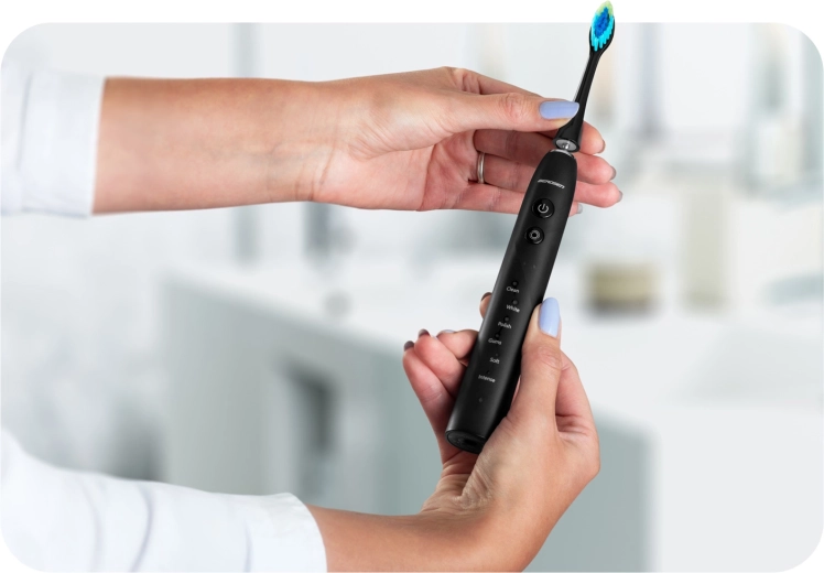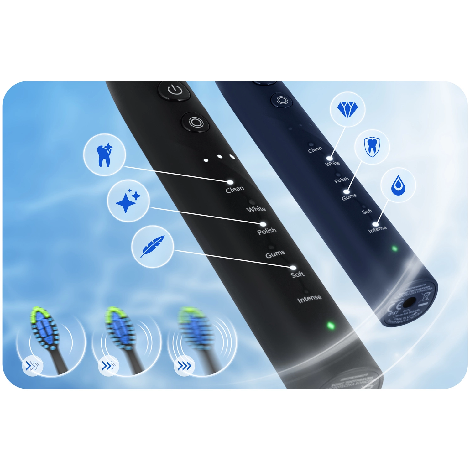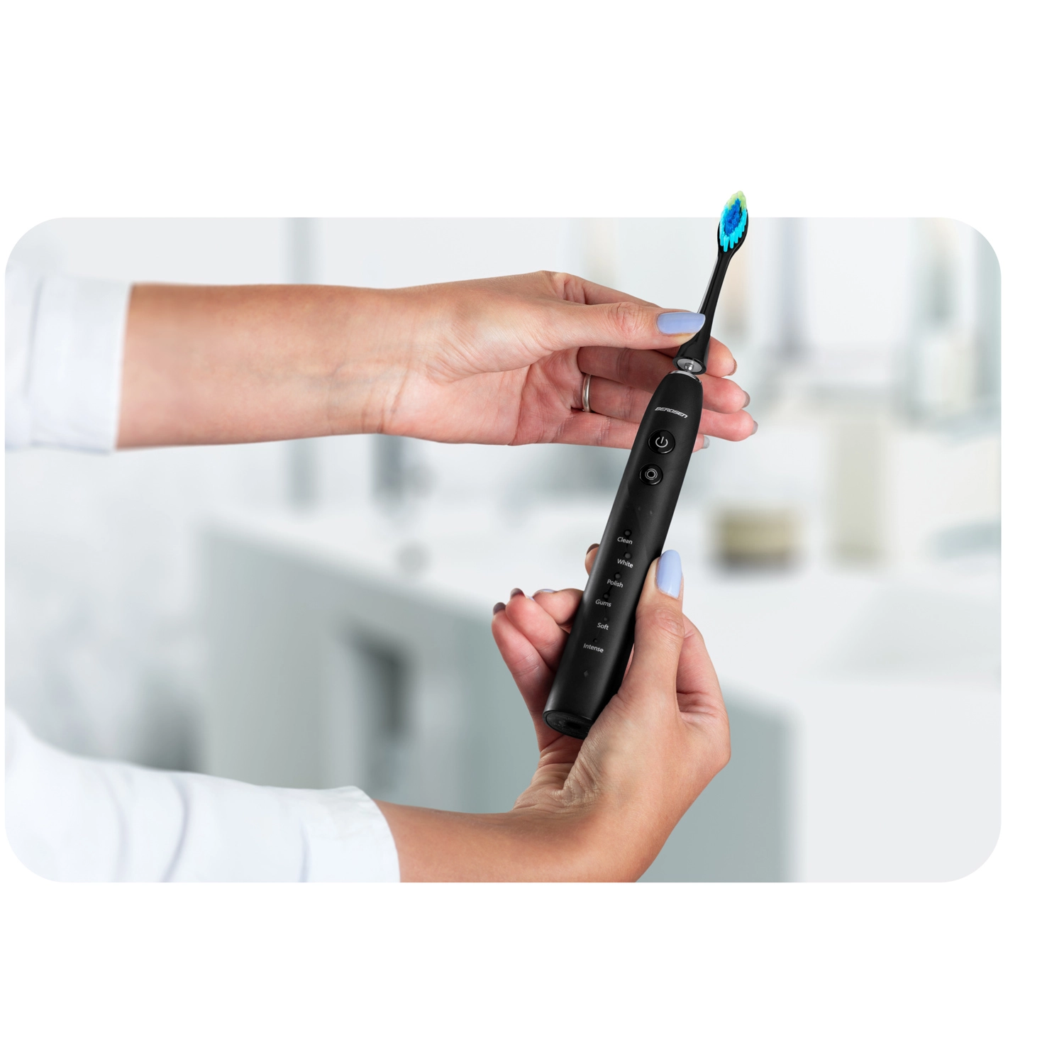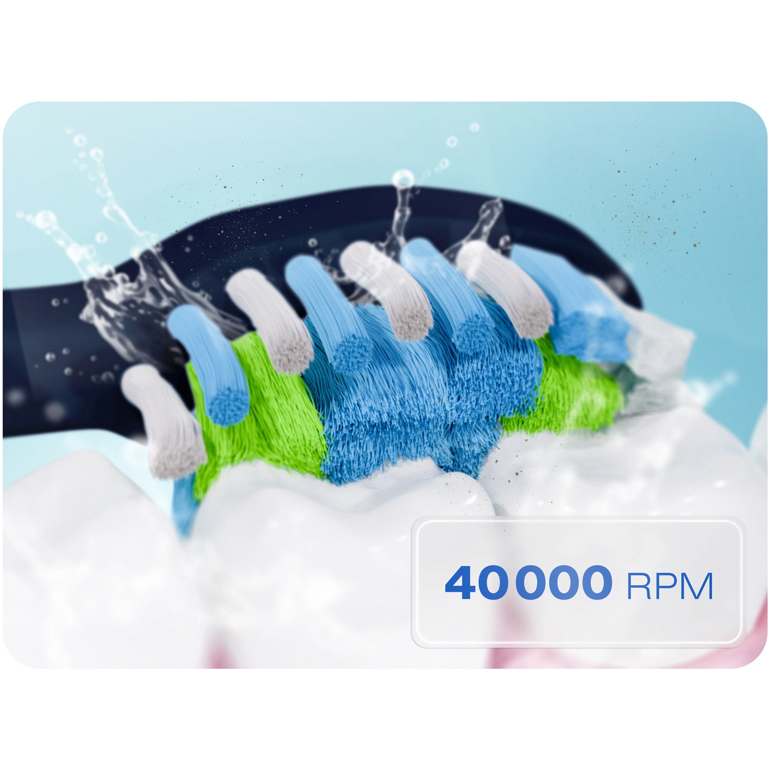 Die Kraft der Schalltechnologie entfernt Zahnbelag und Verfärbungen schnell und sanft. Die Bürstenköpfe mit weichen Borsten passen sich der Zahnform an, und die Rückseite reinigt bequem auch die Zunge für lang anhaltend frischen Atem. Der leistungsstarke Motor erzeugt bis zu 40.000 Vibrationen pro Minute und hilft Ihnen zusammen mit dem smarten Timer, täglich richtig und effektiv zu putzen.