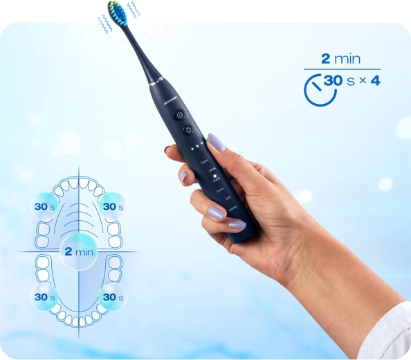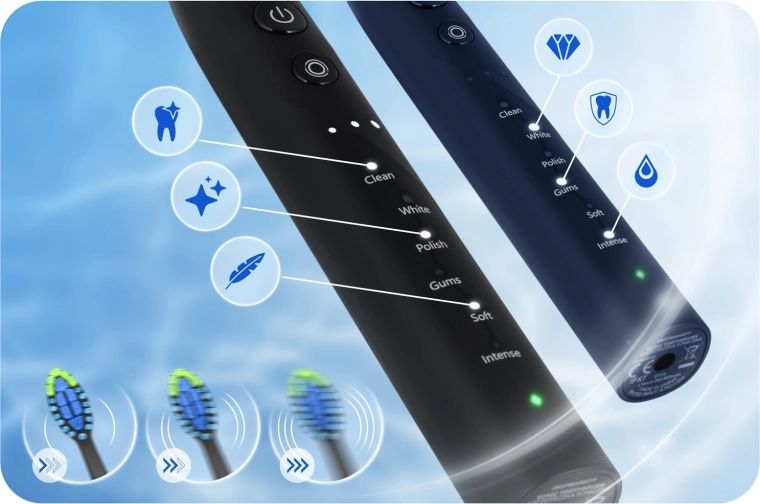 18 Reinigungs-Kombinationen für Ihre Bedürfnisse: 6 Modi (CLEAN, WHITE, POLISH, GUMS, SOFT, INTENSE) und 3 Intensitätsstufen. Von sanfter Pflege für empfindliche Zähne bis zur intensiven Tiefenreinigung – wählen Sie einfach, was passt. Automatische Abschaltung nach 2 Minuten und 30-Sekunden-Intervalle erleichtern die Aufteilung des Mundes in vier Quadranten für gleichmäßige Ergebnisse.