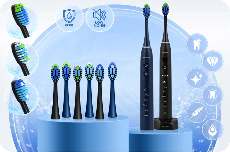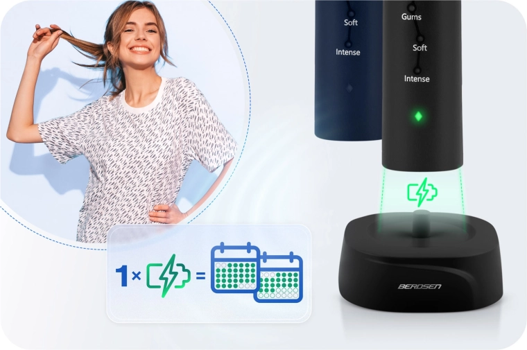 Entdecken Sie täglichen Komfort und professionelle Mundpflege mit dem Set aus zwei Schallzahnbürsten BERDSEN Galaxy Duo. Leistungsstark mit bis zu 40.000 Bewegungen pro Minute, 6 Putzmodi und 3 Intensitätsstufen für gründlich saubere Zähne und schonende Pflege des Zahnfleischs. Im Lieferumfang: 6 austauschbare Bürstenköpfe, ein 2-Minuten-Timer mit 30-Sekunden-Intervallen, lange Akkulaufzeit bis zu 50 Tage pro Ladung und Wasserfestigkeit IPX8 – ideal für Paare und Familien.