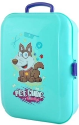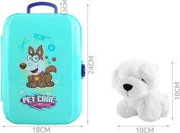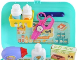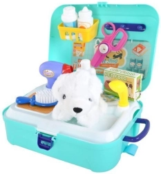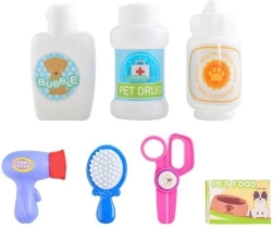 Zum Set gehören Werkzeuge wie Bürste, Föhn, Futterbox, Shampoo und Medikamente, was kreatives Spielen für Kinder ermöglicht.
