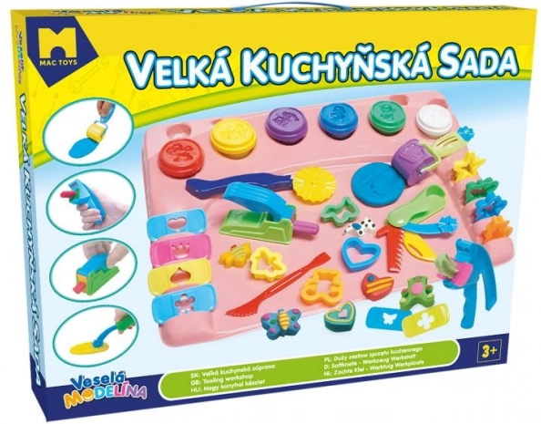 Entdecken Sie die kreative Welt mit dem Modelo-Kinderset – großes Küchenset mit Unterlage und 31 Zubehörteilen, ergänzt durch 6 Becher Knetmasse in Grundfarben. Kinder können schneiden, formen und dekorieren, während die Unterlage den Tisch schützt und für Ordnung sorgt. Ideal zur Förderung der Feinmotorik, Kreativität und Fantasie.