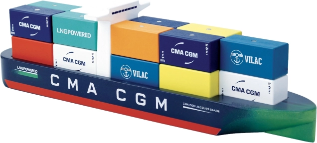 Dieses stylische Holzschiff bringt die Welt großer Häfen ins Kinderzimmer. Dank der 18 magnetischen Container können Kinder die Ladung leicht be- und entladen und trainieren Fantasie sowie Koordination. Das Modell ist von einem echten, mit LNG betriebenen Schiff inspiriert und entstand in Zusammenarbeit mit CMA CGM.