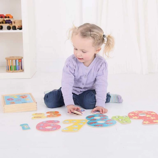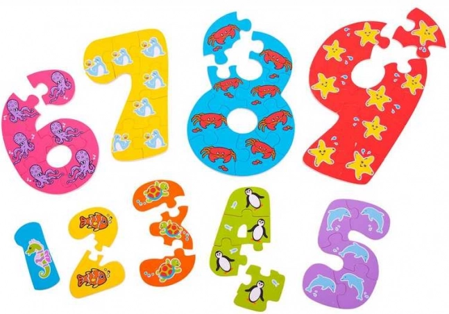 Dieses Set aus Lernpuzzles hilft Kindern, Ziffern zu erkennen und ihnen Mengen zuzuordnen. Jede Zahl besteht aus der entsprechenden Anzahl an Teilen (z. B. hat die Zahl 4 vier Teile) mit fröhlichem Tiermotiv – das unterstützt natürliches Lernen und die Freude am Puzzeln.
