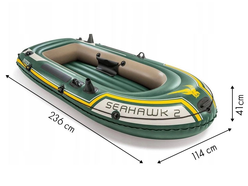 Das beliebte aufblasbare Zweipersonenboot INTEX Seahawk 2 ist ideal für Freizeitfahrten und Angeln auf ruhigen Gewässern. Es bietet eine Tragfähigkeit von 240 kg, 3 Luftkammern für Sicherheit, einen weichen aufblasbaren Boden für Komfort sowie praktische Halterungen für Paddel und Ruten. Im Set enthalten sind 2 leichte Paddel, eine leistungsstarke Kolbenpumpe und ein Reparaturset.