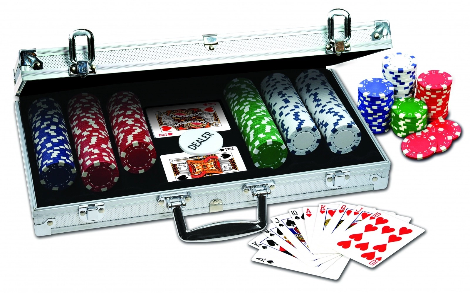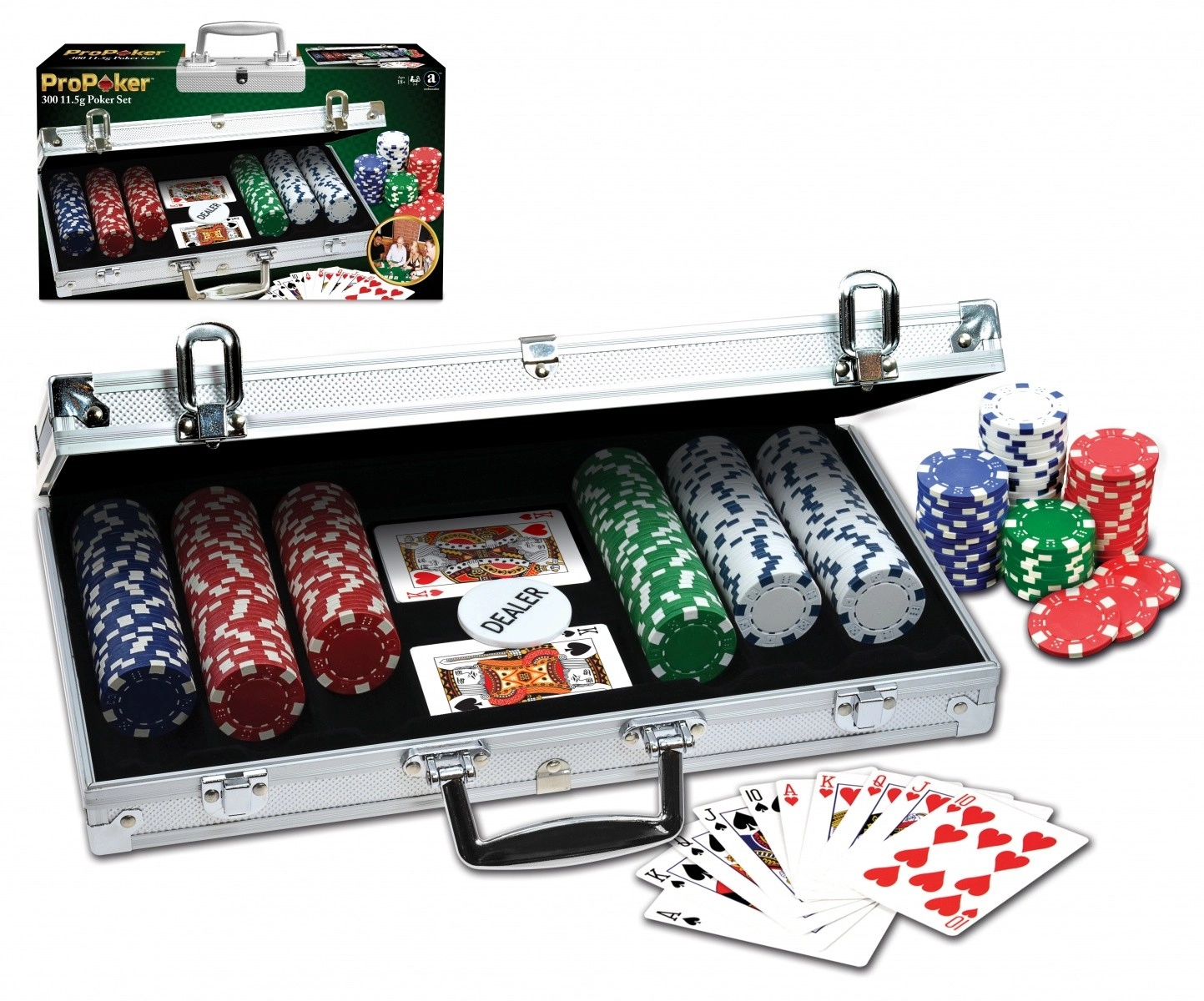 Komplettes Poker-Set in einem eleganten Aluminiumkoffer für Heimturniere und Unterhaltung mit Freunden. Enthält 300 hochwertige Chips mit einem Gewicht von 11,5 g in 4 Farben mit Würfelsymbolen – ideal für ein authentisches Spielerlebnis.