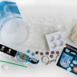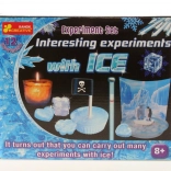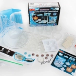 Die Box umfasst eine bunte Auswahl an Werkzeugen und Materialien: Eisformen, Knetmasse, Kerze, kleine Steine, Becher, Trinkhalm, Lebensmittelfarbe, Schablonen, Faden und weiteres Zubehör. Eine leicht verständliche tschechische Schritt-für-Schritt-Anleitung ist ebenfalls enthalten, sodass Kinder fast sofort mit dem Experimentieren beginnen können.