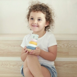 Das Set enthält sechs pastellfarbene Ringe, einschließlich eines Hauptkreises mit Bärenkopf, die visuelle und motorische Fähigkeiten entwickeln.